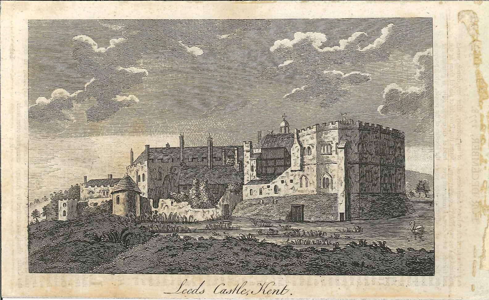 - DescriptionEngraved print of a view of Leeds castle; shows a general view of the castle walls & moat; taken from a journal or magazine, text (including the date of December 1778) on the reverse; glued on to card.