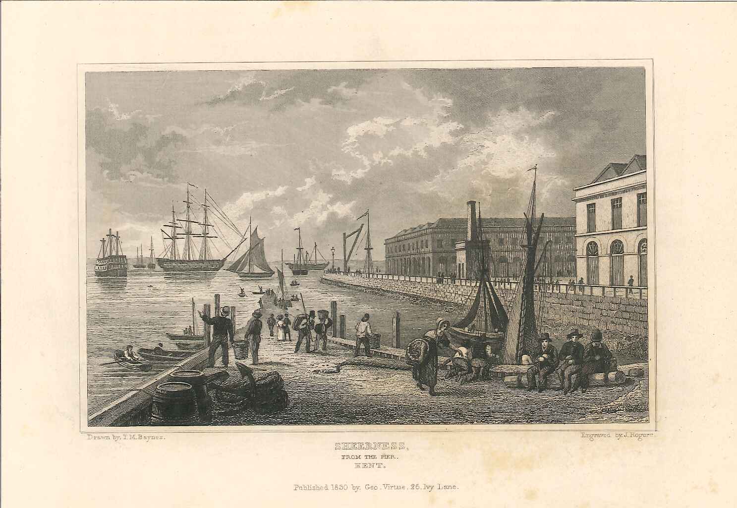 - DescriptionPrint of a waterfront view of Sheerness; shows a busy scene at the long pier, with fishing boats, rowing boats & in the distance larger sailing vessels; various pedestrians in the foreground. Originally produced for the "England's Topographer" series of Kent views (London 1828-1831).