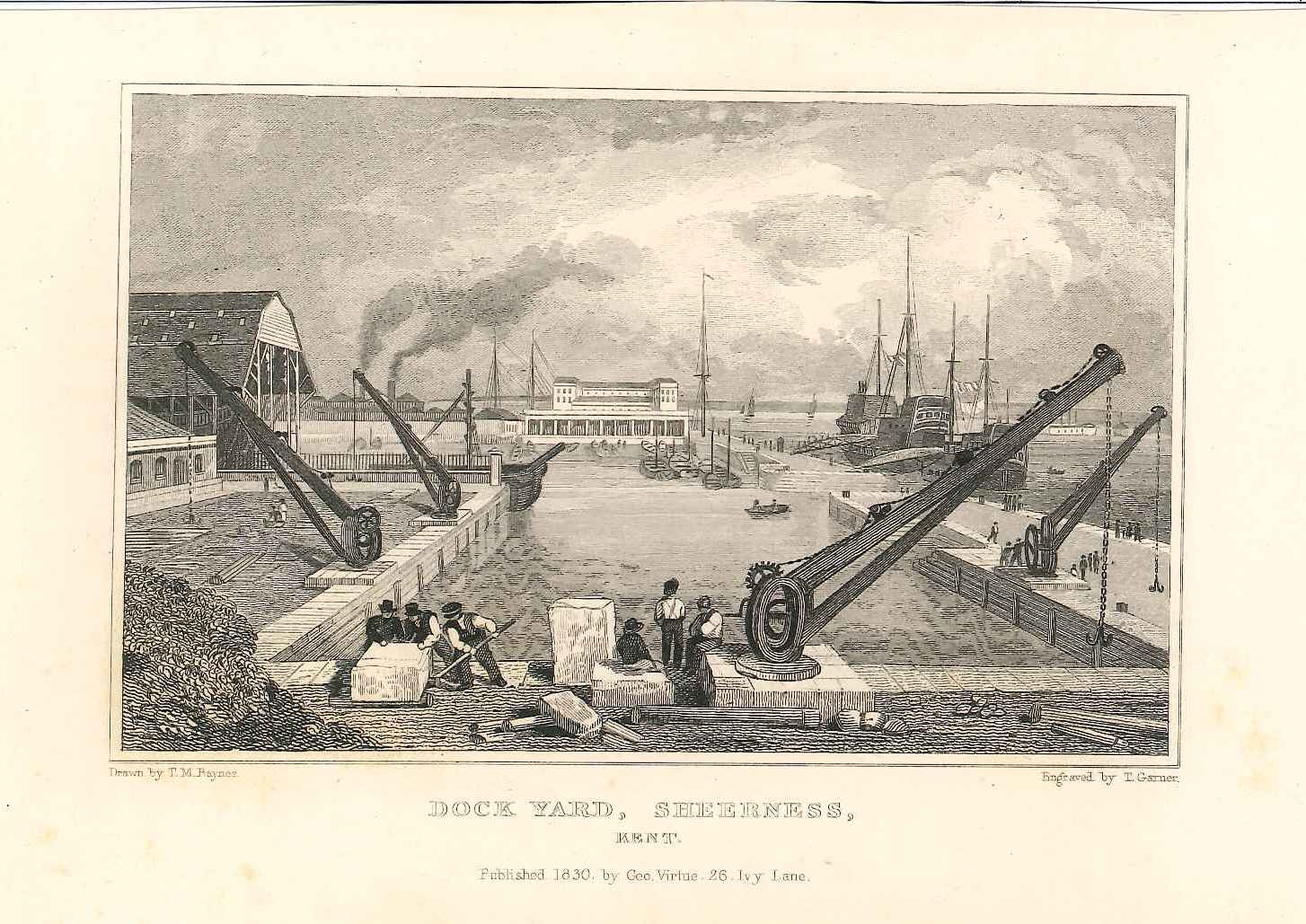 - DescriptionPrint of a waterfront view of Sheerness Dockyard; shows a busy scene with docks, cranes & various workmen; in the distance are large sailing vessels. Originally produced for the "England's Topographer" series of Kent views (London 1828-1831).