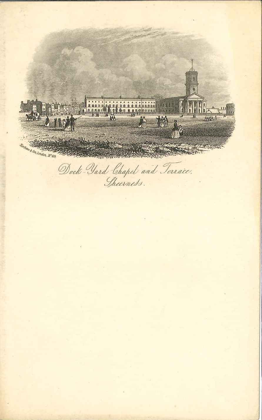 Engraved print of Sheerness dockyard chapel & terrace, circa 1860; seen from a distance, various pedestrians in the open space in the foreground. Printed by Kershaw & Son, who ran the London Stereoscope Co; printed on folded paper, so intended as a notelet for short letters. Illustrated letterheads like this one were sent by visitors to the seaside, the Lake District, the Scottish Highlands and other British tourist attractions in the mid 19th century. They were precursors of the picture postcards which began to supplant them after the introduction of the half-penny post in 1870.