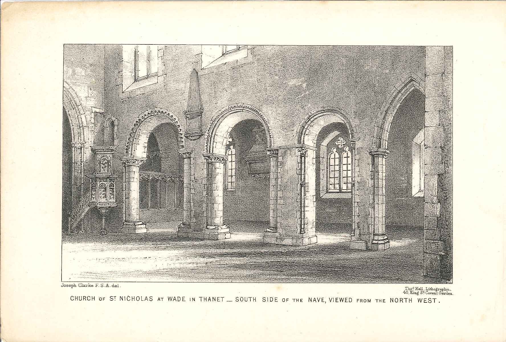 - Descriptionlithographic print of details of the interior of the church of St Nicholas at Wade, Thanet; south side of the nave, showing internal arches & pulpit.