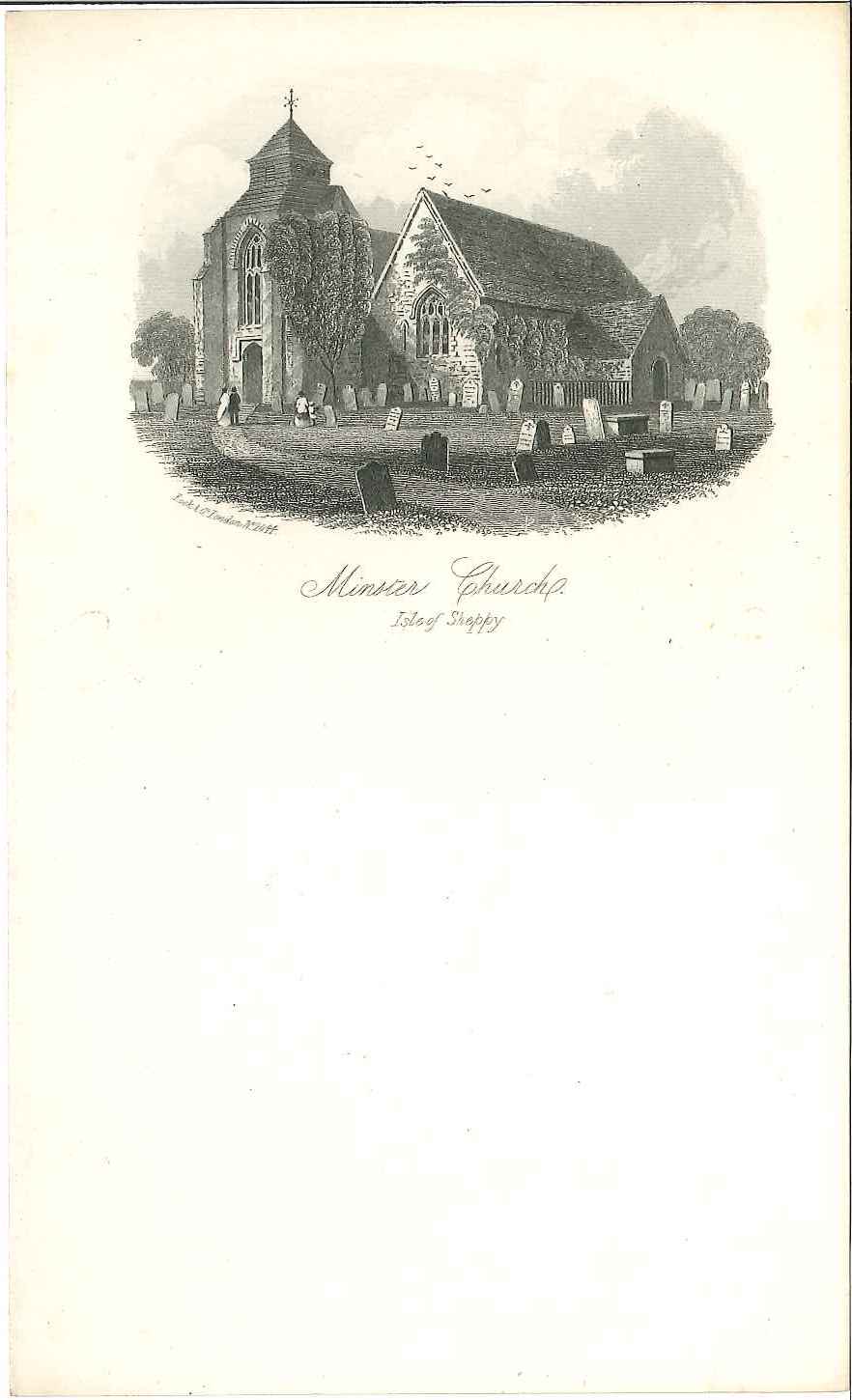 Engraved print of Minster church, Sheppey; shows some pedestrians in the graveyard in the foreground. Printed on folded paper, so intended as a notelet for short letters. Illustrated letterheads like this one were sent by visitors to the seaside, the Lake District, the Scottish Highlands and other British tourist attractions in the mid 19th century. They were precursors of the picture postcards which began to supplant them after the introduction of the half-penny post in 1870.