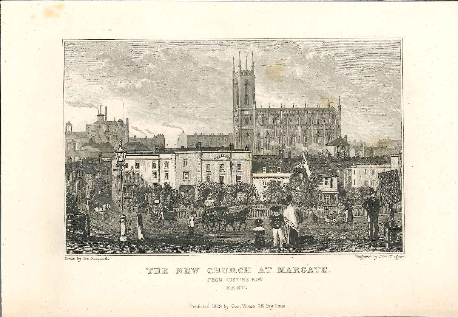 - DescriptionPrint of a view of the New Church at Margate; seen from Austin Row; signboard for the Theatre Royal & various pedestrians in the foreground. Originally produced for the "England's Topographer" series of Kent views (London 1828-1831).