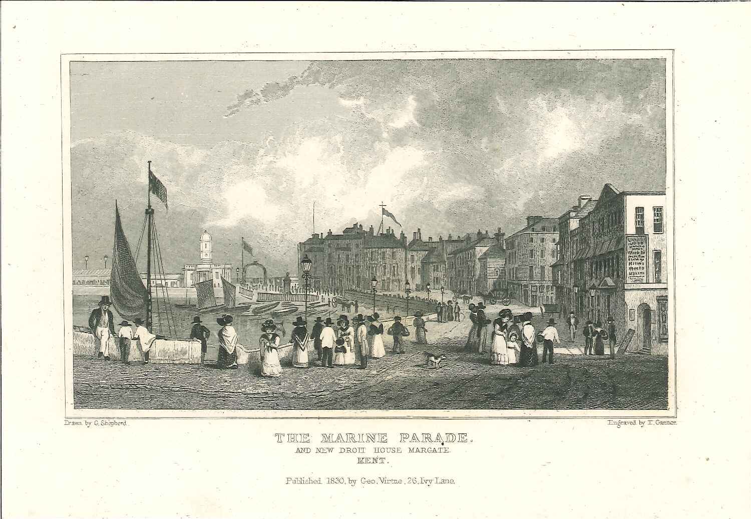 - DescriptionPrint of a view of the Marine Parade at Margate; shows a busy seafront scene with some small boats & many various pedestrians in the foreground. Originally produced for the "England's Topographer" series of Kent views (London 1828-1831).