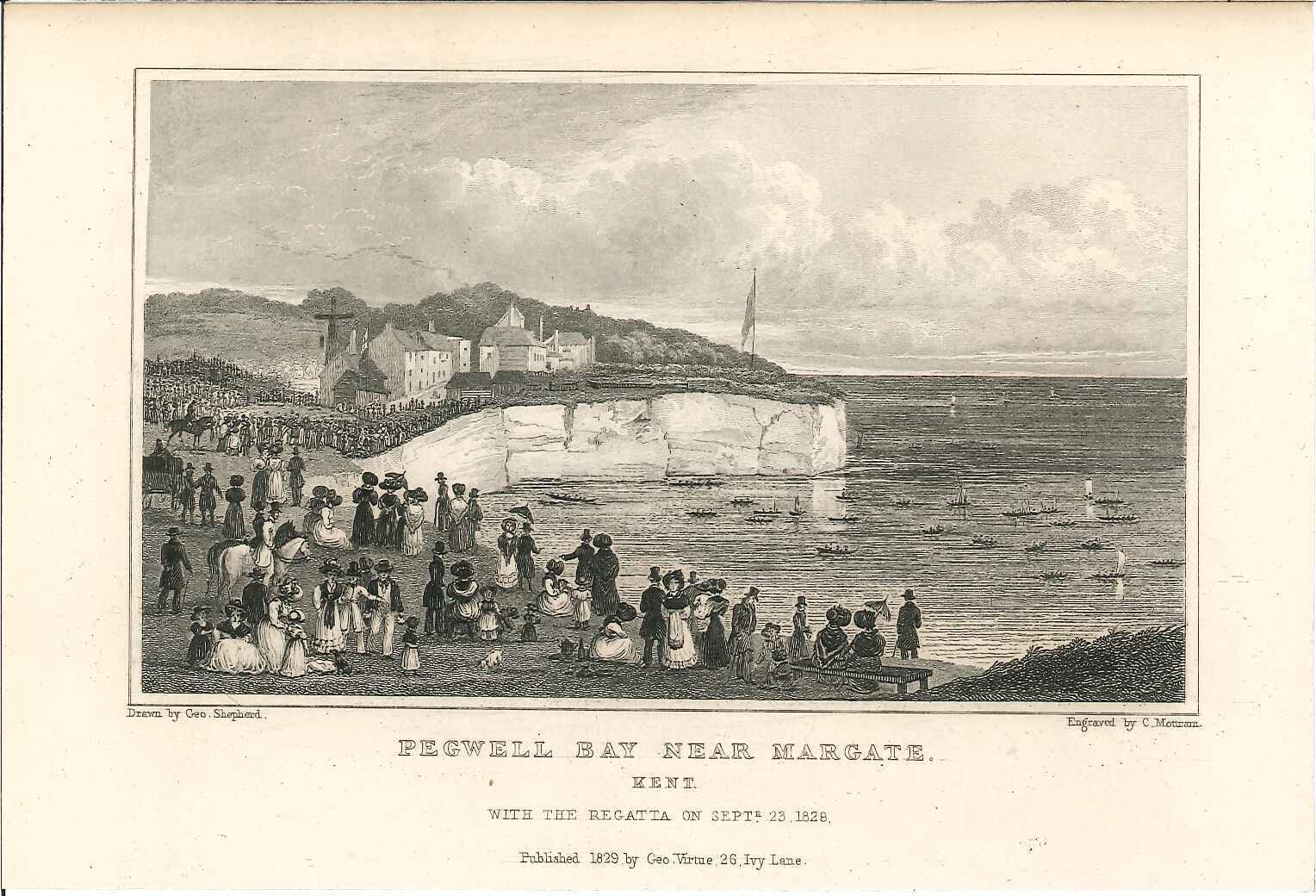 - DescriptionEngraved print of a view of Pegwell Bay Regatta looking out to sea with crowds of people on cliff tops looking at many small boats on the sea. Originally produced for the "England's Topographer" series of Kent views (London 1828-1831).