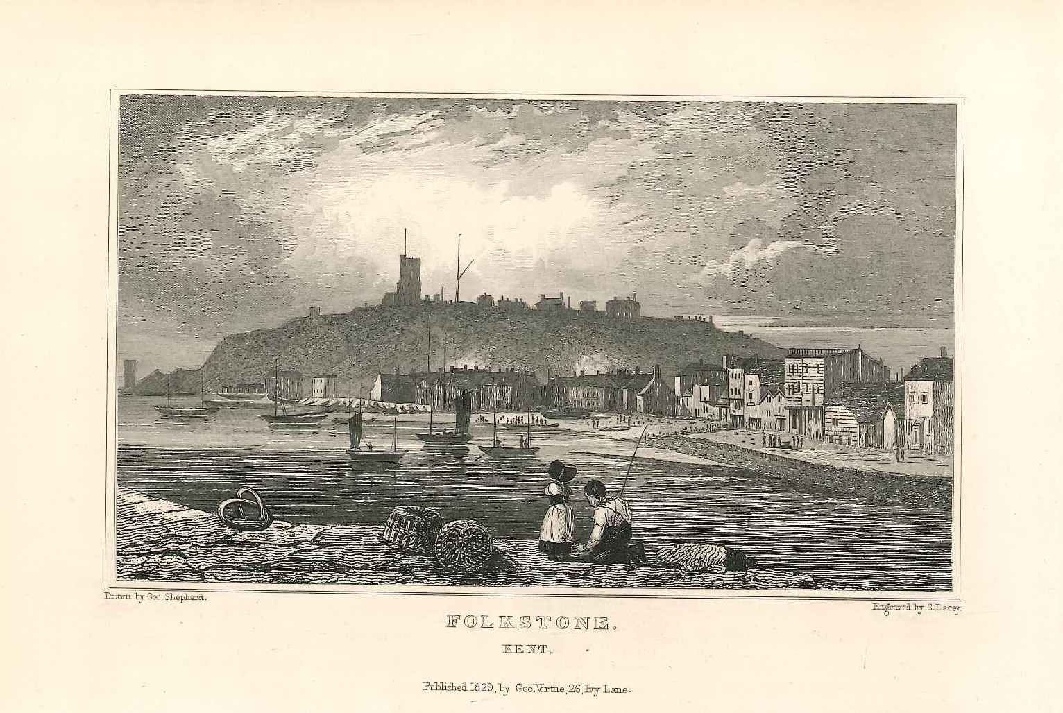 - DescriptionEngraved print of the harbour at Folkestone; a view across the sea front with various buildings & pedestrians; In the background is a hill with a (church?) tower on it; in the foreground are children fishing & lobster pots. Originally produced for the "England's Topographer" series of Kent views (London 1828-1831).