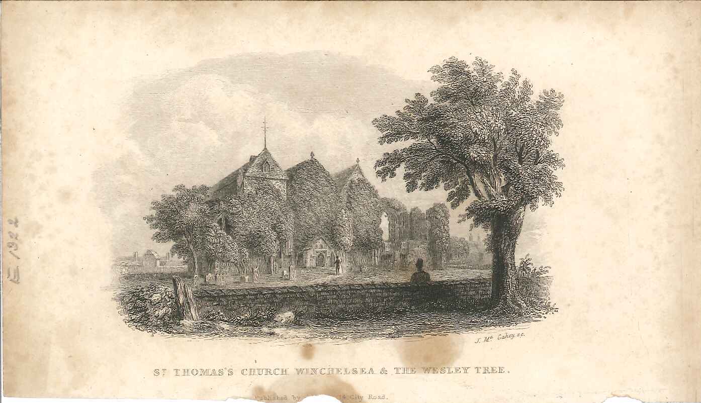 Engraved print of the St Thomas's church & the Wesley Tree at Winchelsea