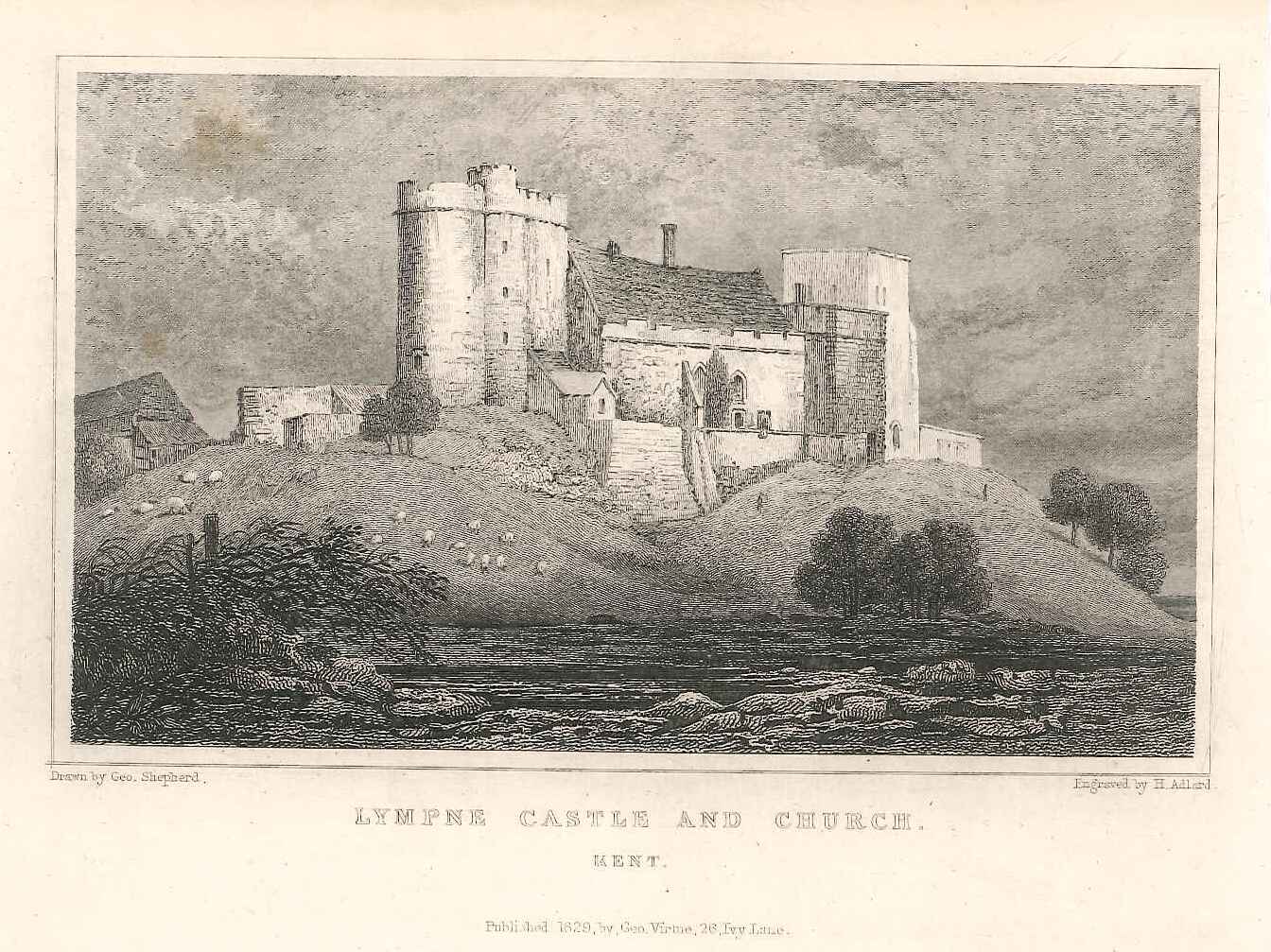 - DescriptionEngraved print of Lympne castle; seen from a distance with sheep on the grassy slopes in front. Originally produced for the "England's Topographer" series of Kent views (London 1828-1831).
