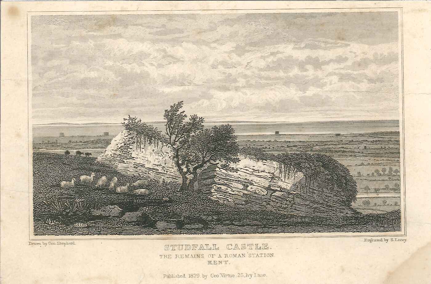 - DescriptionEngraved print of some of the ruins of Studfall (Lympne) castle; with sheep on the grassy slopes in front; these are the remains of the Roman Saxon Shore fort built on the slopes in front of the later medieval castle. Some light foxing. Originally produced for the "England's Topographer" series of Kent views (London 1828-1831).