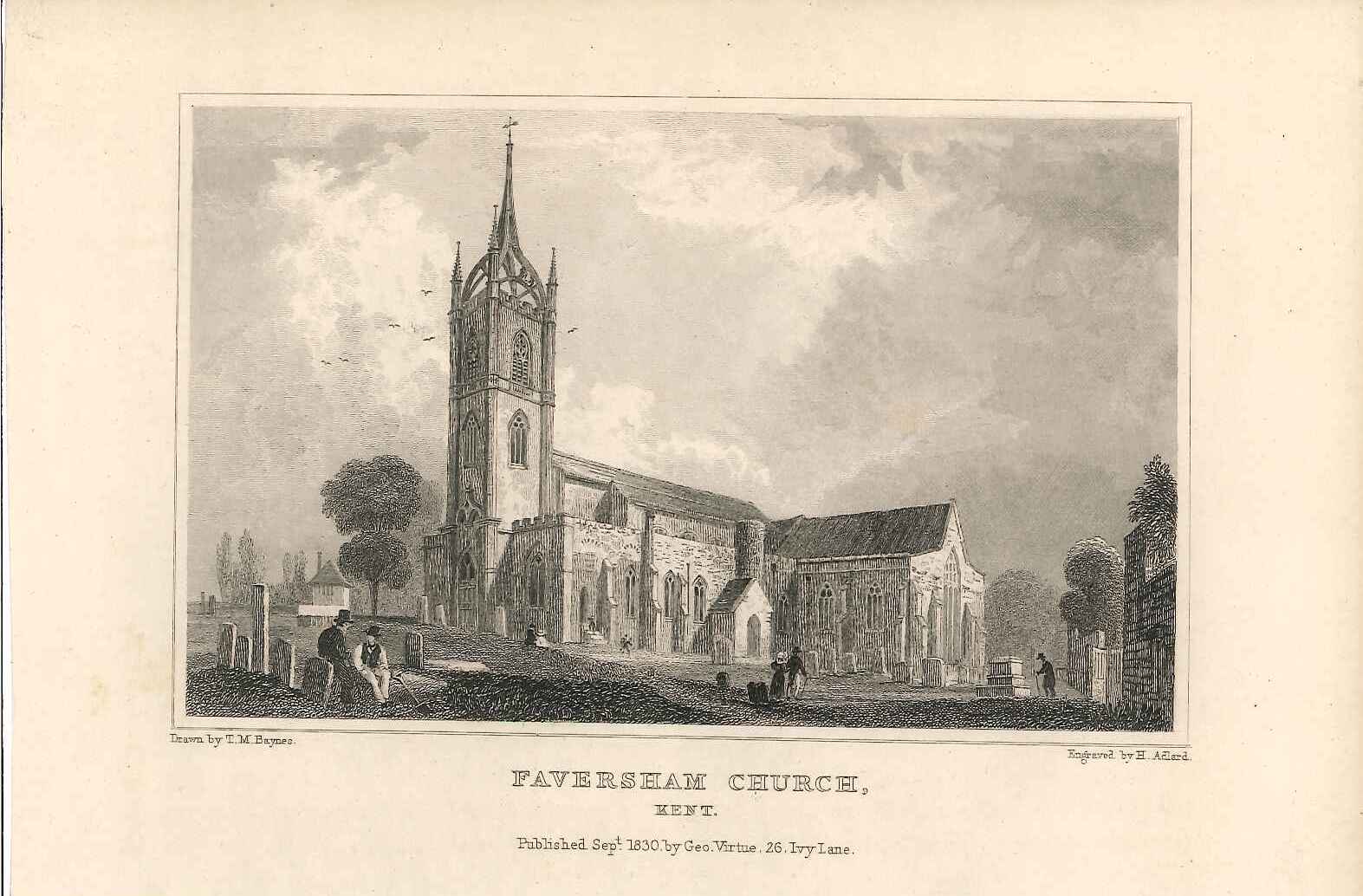 - DescriptionEngraved print of Faversham church, Sheppey; shows some pedestrians & gravediggers in the graveyard in the foreground. Originally produced for the "England's Topographer" series of Kent views (London 1828-1831).