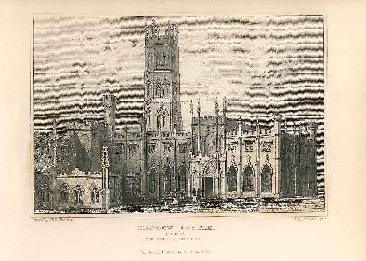 - DescriptionPrint of a view of Hadlow castle in Kent, the seat of A B May, esq; large Victorian Gothic folly with tower; pedestrians in the foreground. Originally produced for the "England's Topographer" series of Kent views (London 1828-1831).