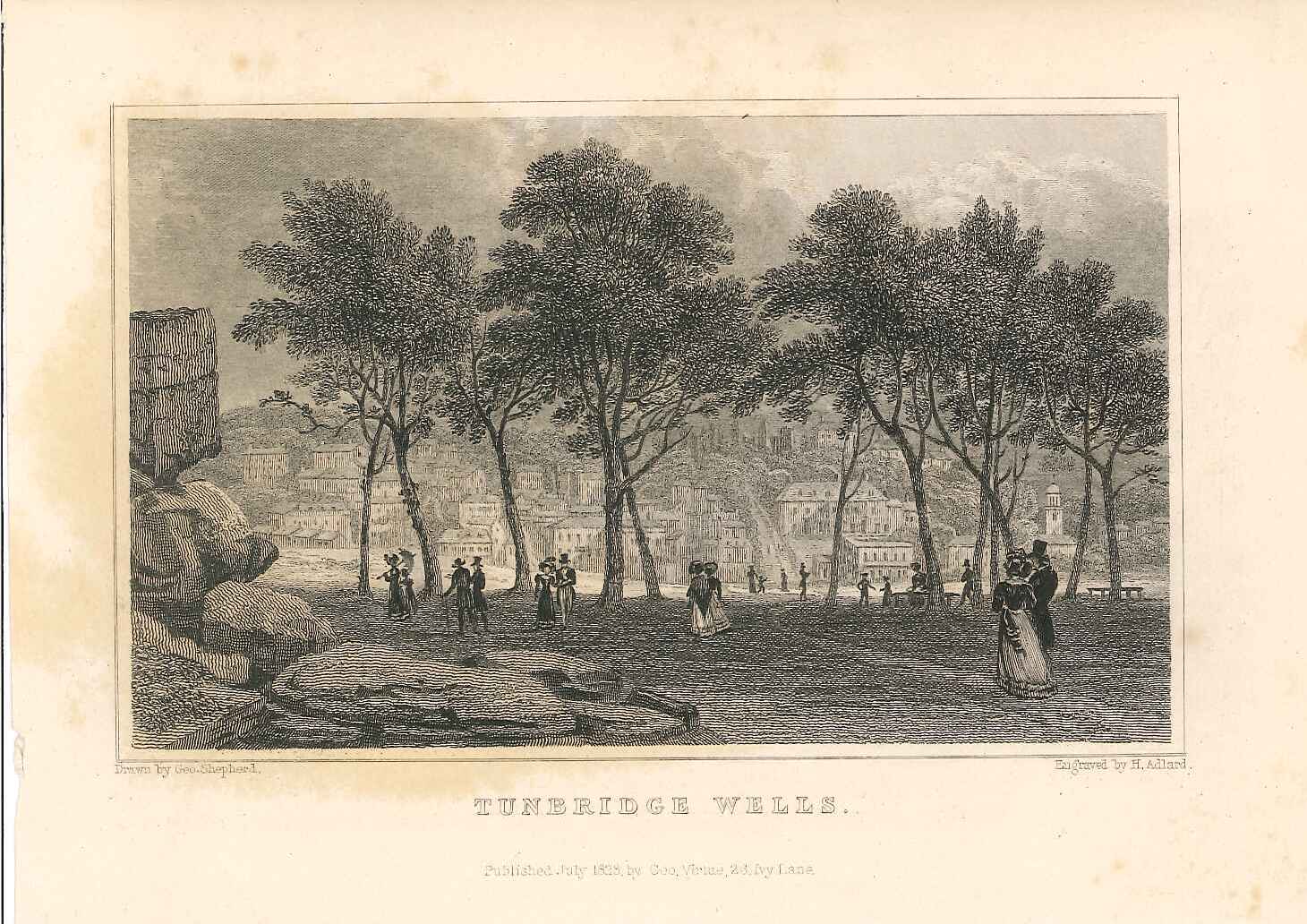 - DescriptionPrint of a view of Tunbridge Wells; shows rocks to the left, pedestrians in the foreground, the town in the background. Paper has slightly yellowed. Originally produced for the "England's Topographer" series of Kent views (London 1828-1831).