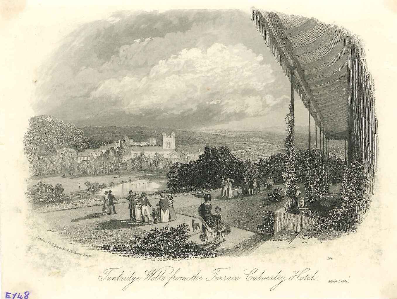 - DescriptionPrint of Tunbridge Wells, from the terrace of the Calverley Hotel; individuals in the foreground.