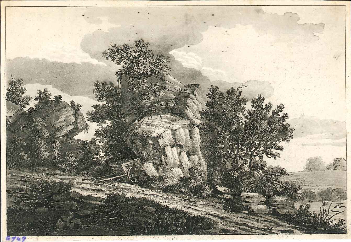 Lithographic print of rocks at Tunbridge Wells; shows a small handcart tucked behind a rock outcrop.