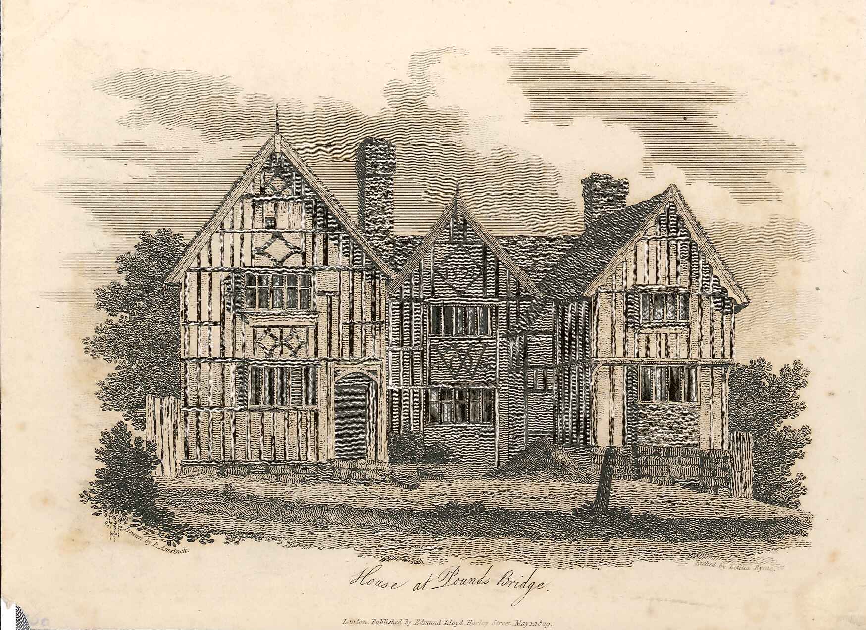 - DescriptionEngraved print of a timber-framed house at Poundsbridge near Tunbridge Wells; the building has a plaque showing the date '1593'.