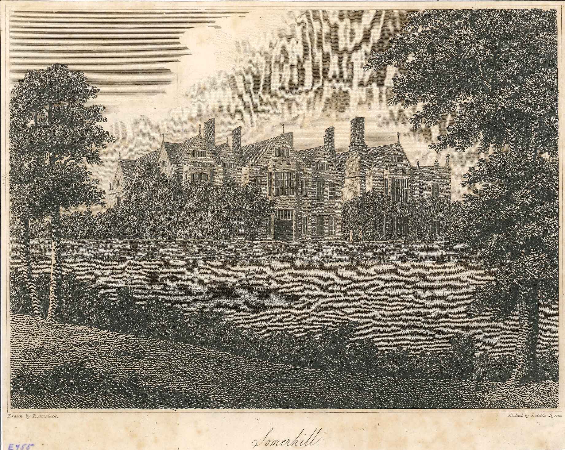 - DescriptionEngraved print of Somerhill House, nearTonbridge; shows stateley home viewed across wooded parkland.