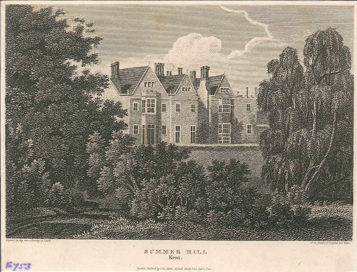 - DescriptionEngraved print of a distant view of Somerhill House, near Tonbridge; seen through wooded parkland; published for the book 'Beauties of England & Wales'.