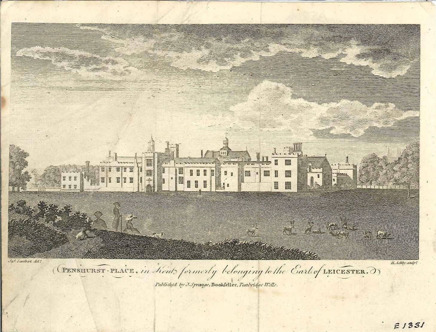 - DescriptionEngraved print of Penshurst Place; seen from a distance across some parkland with deer; pedestrians with a dog in the foreground.
