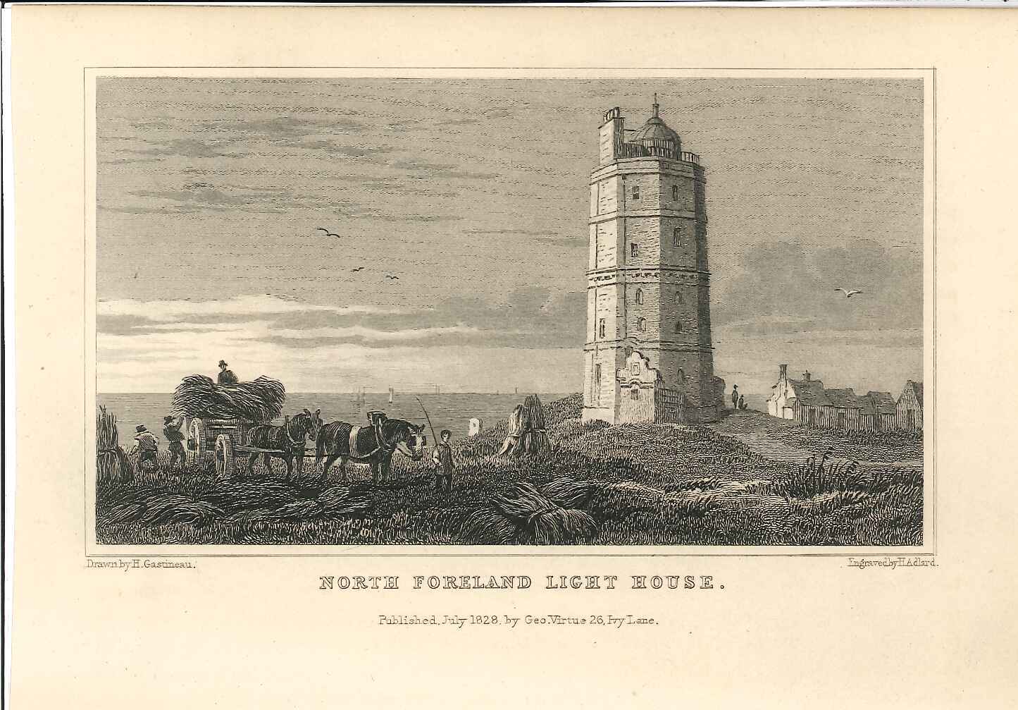 - DescriptionEngraving of the North Foreland Lighthouse near Broadstairs in East Kent; harvest being gathered in the foreground Originally produced for the "England's Topographer" series of Kent views (London 1828-1831).
