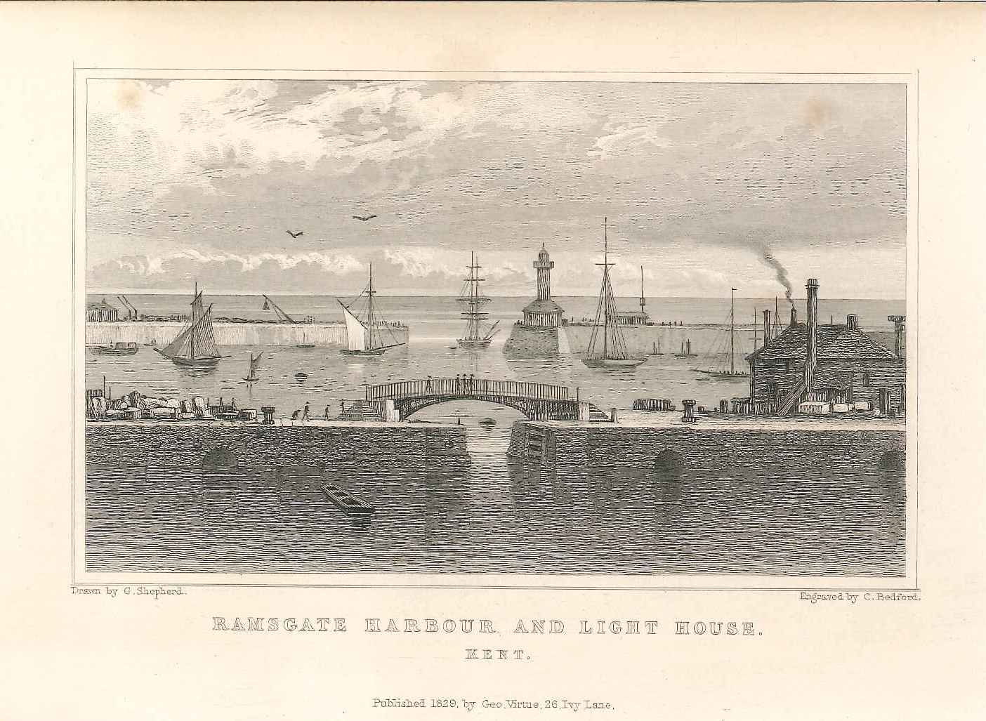 - DescriptionPrint of a waterfront view of the harbour at Ramsgate; shows a busy scene looking out to sea with various sailing boats; quay has goods unloaded, lighthouse beyond. Originally produced for the "England's Topographer" series of Kent views (London 1828-1831).