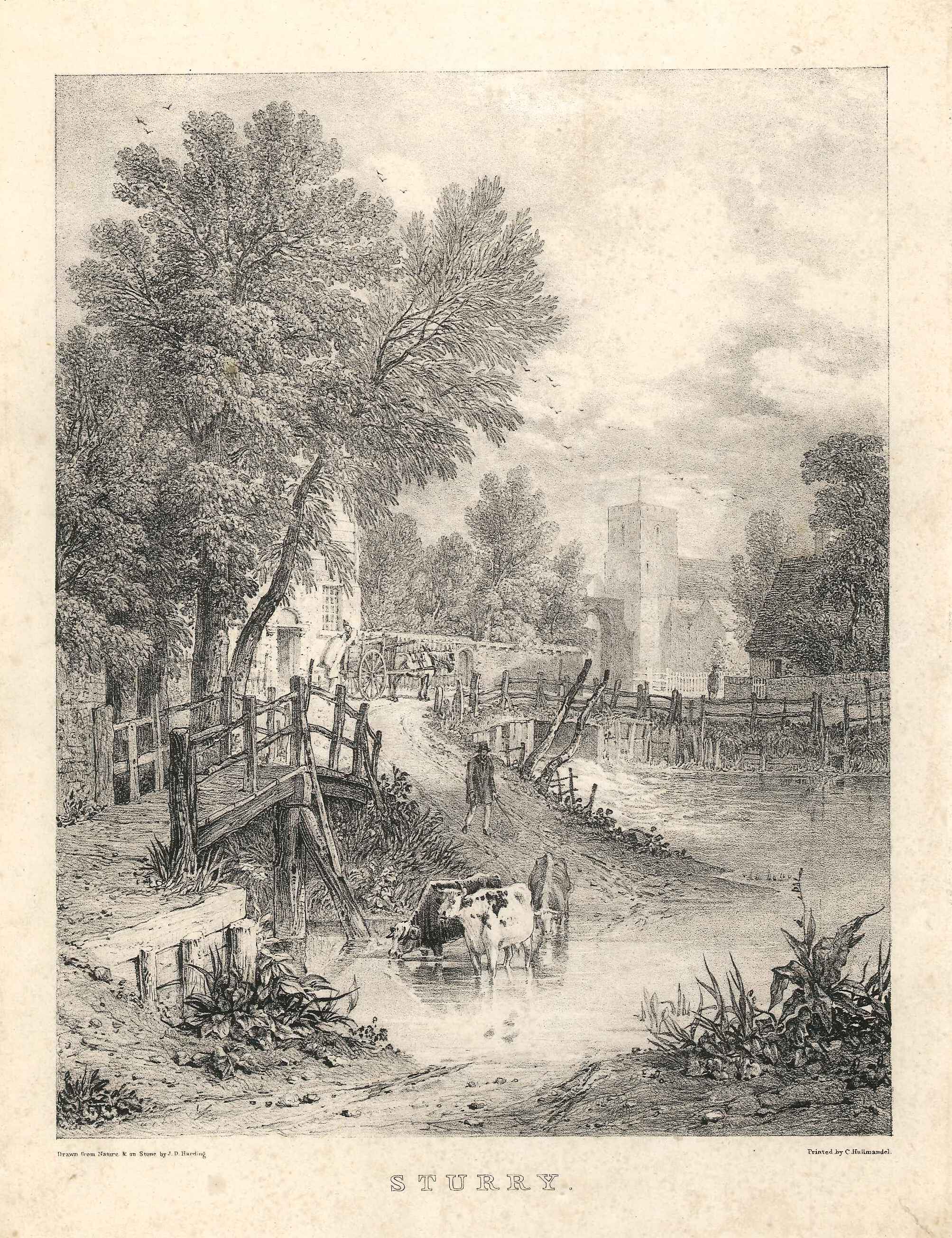 - DescriptionLithographic print of a view of Sturry, near Canterbury; shows a river crossing with bridge and church in the background; cattle being watered in the foreground. Mounted on card.