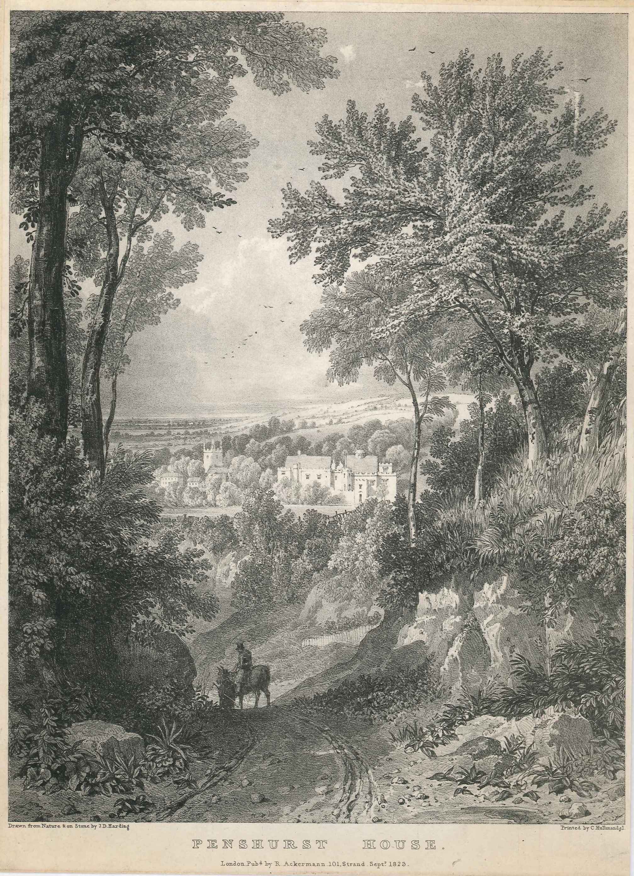 - DescriptionLithographic print of a view of Penshurst House; seen from a distance, from a wooded road; rider & pedestrian in the foreground. Mounted on card.