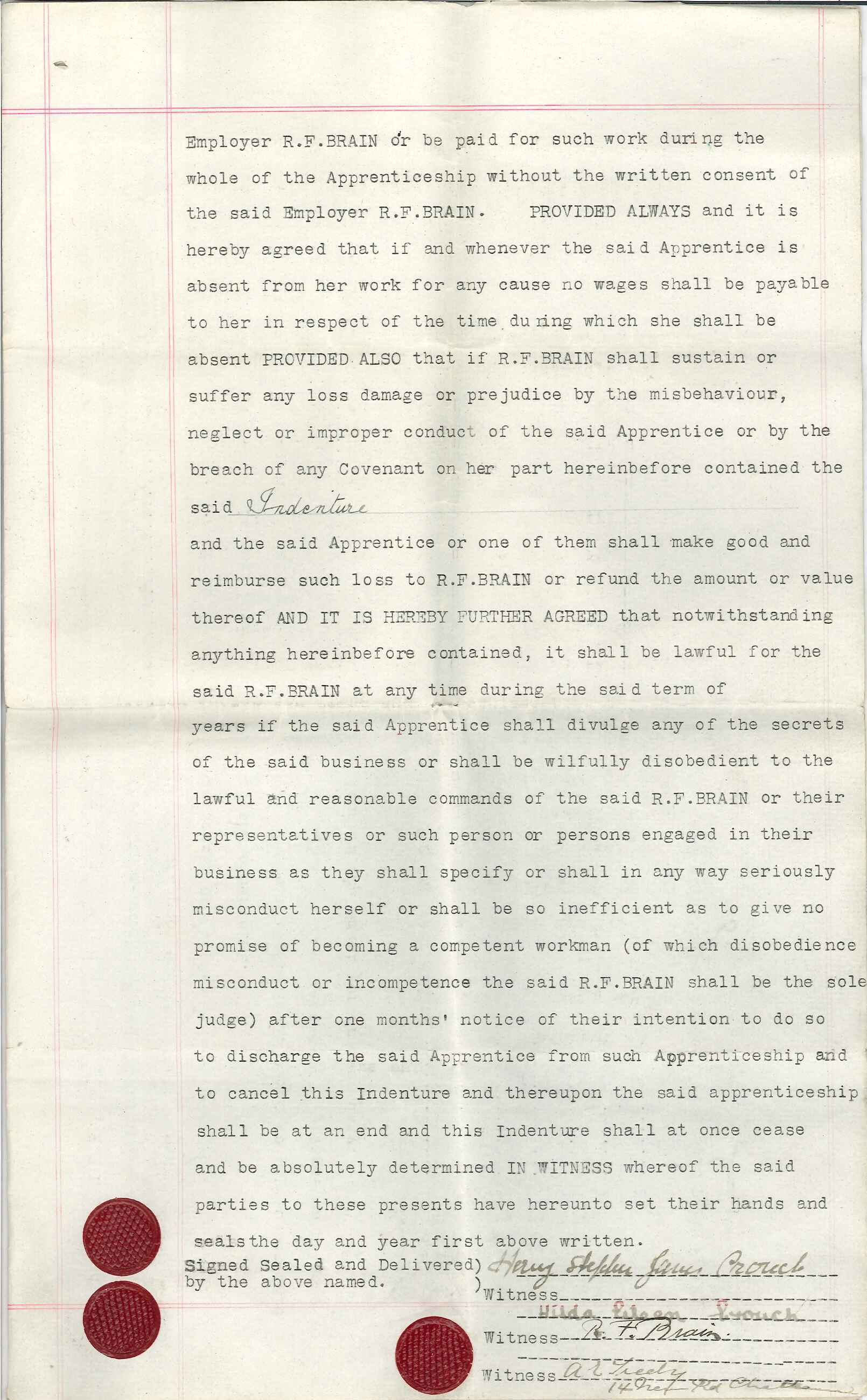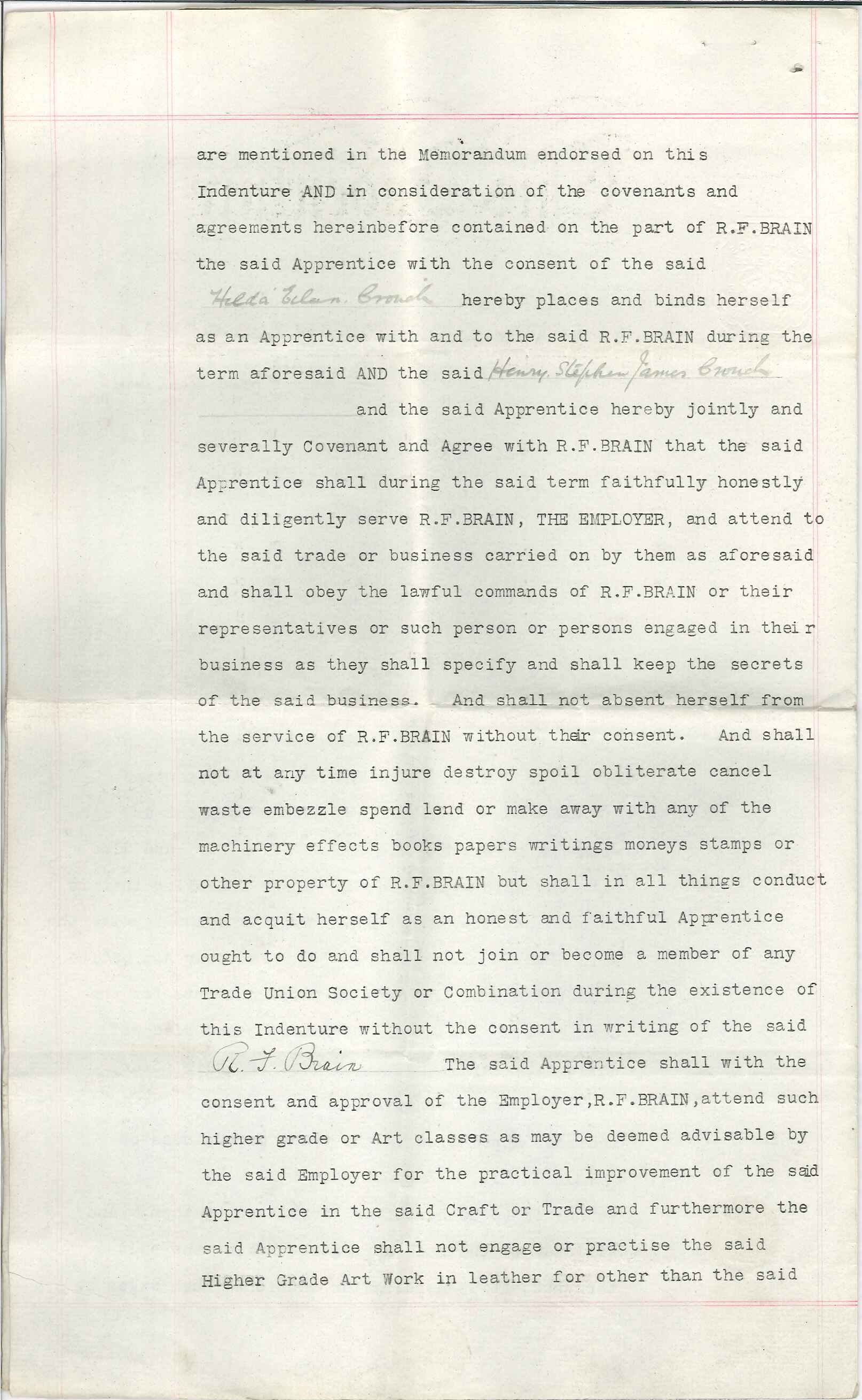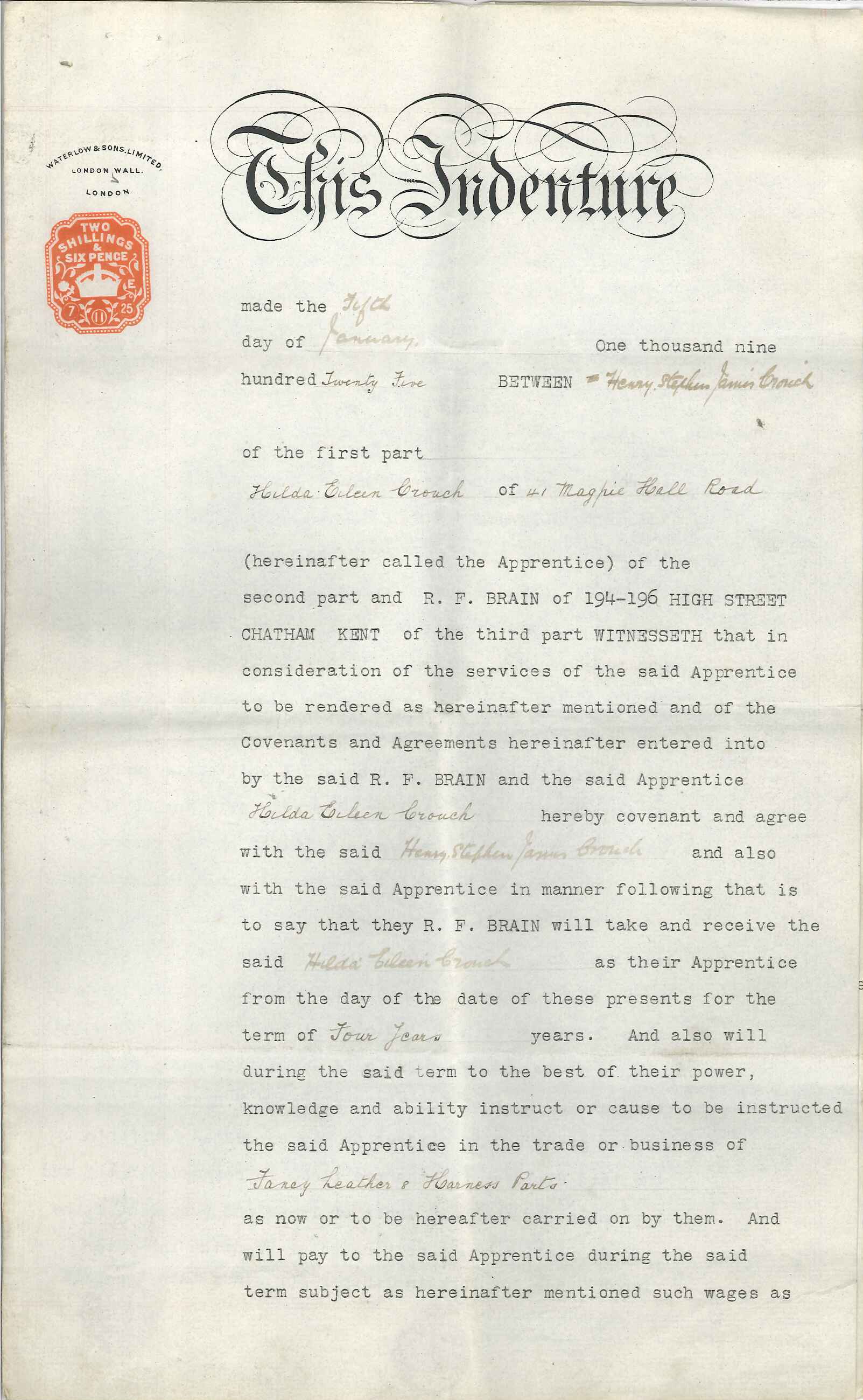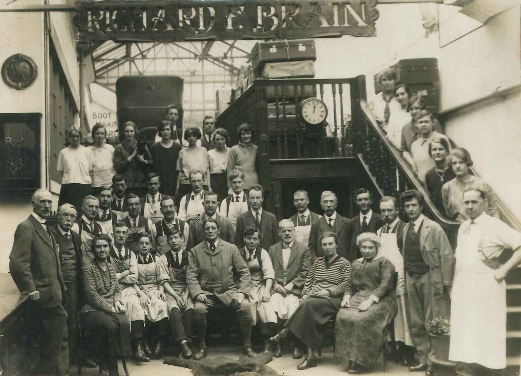 A box of numerous small hand tools, materials & some ephemera (including an indenture document & 1927 staff photograph) owned by Hilda Crouch who worked for Richard F Brain; she worked with small hand tools on fancy leatherwork. In the photograph she is standing at the bottom of the stairs on the right, whilst her sister Vera Crouch is third from the top of the stairs. Donated by Hilda's son.