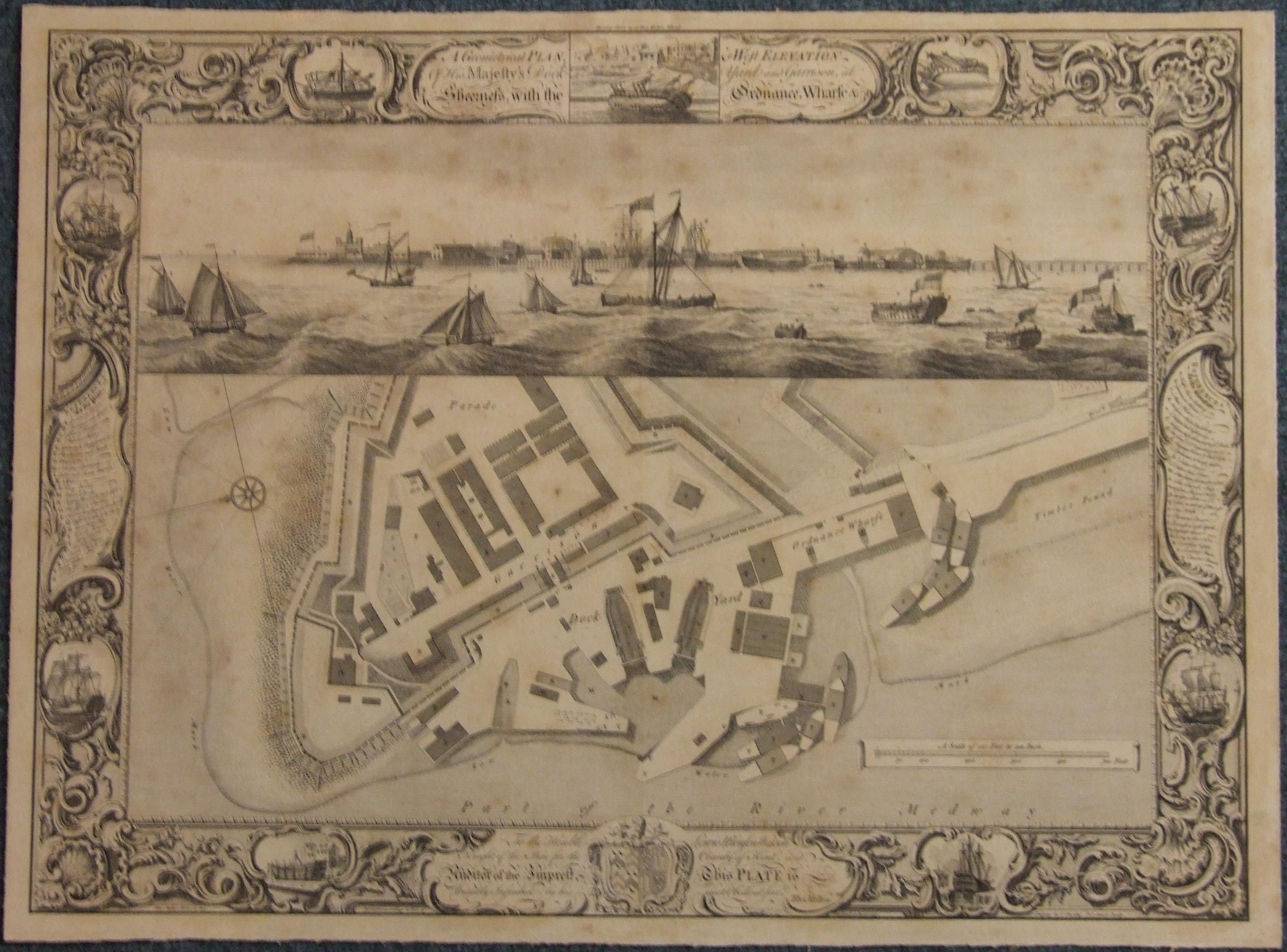 Engraving; plan & view of Sheerness Dockyard in 1755; plan with key for main buildings & features; header has view (west elevation) with ships, etc, also with a key for features. Mounted on card, previously on display at Eastgate house. Two copies of this are in the museum collection - this one is not actually marked 'E449', so may be just a duplicate.