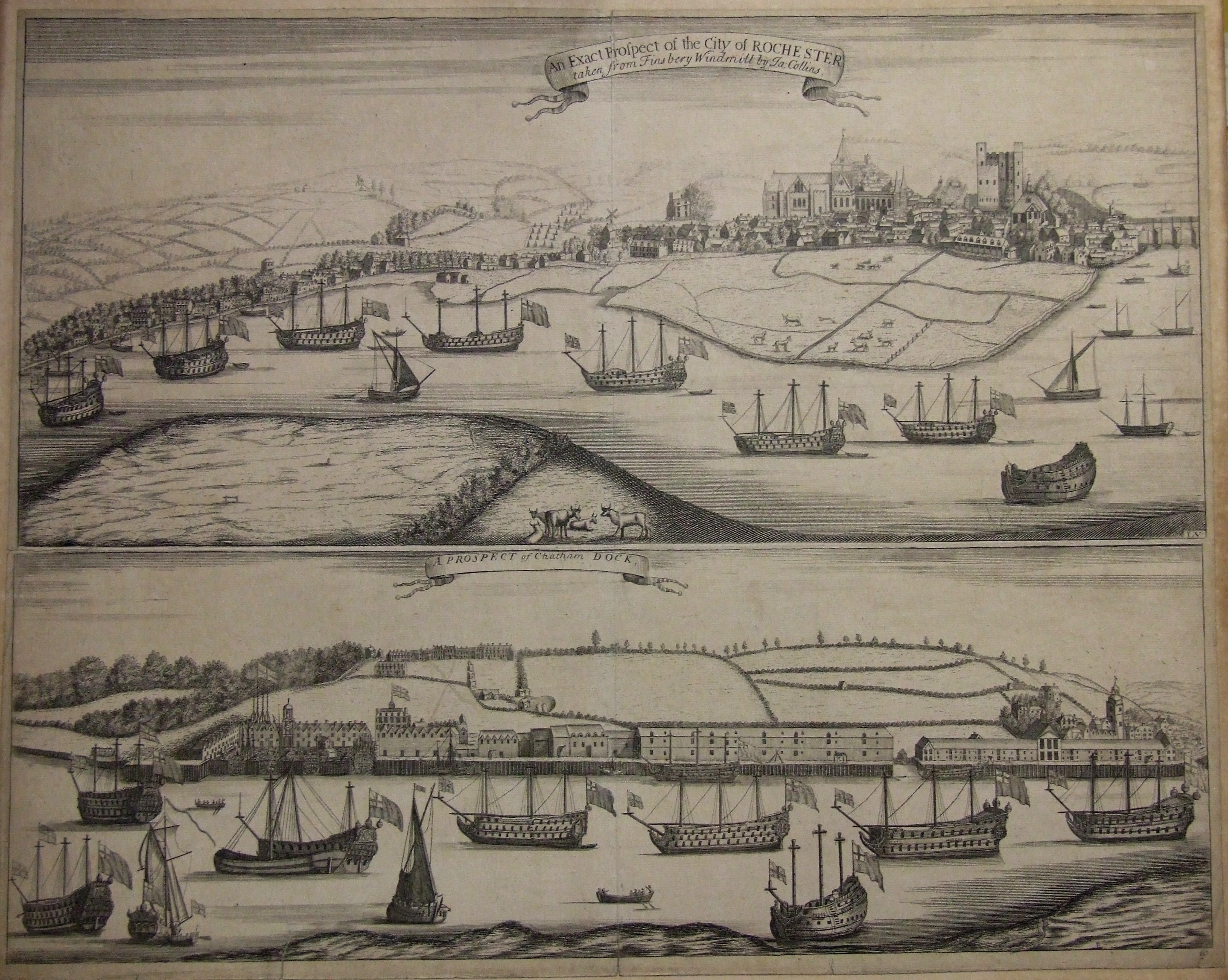 Engraving of a panoramic view of Rochester & Chatham Docks, presented to 2 sections, one above the other; viewed from Frindsbury windmill; details of the city's main buildings, Chatham dockyard; the ships are Navy vessels some ave been 'laid up in ordinary', meaning that they have been stripped of their guns and most of the rigging apart from the lower masts. These were ships that were held in 'reserve', they could either be recommissioned in the event of a war, broken up for scrap, or 'hulked' (converted into store, hospital or prison ships). Framed & glazed, presumably formerly on display.