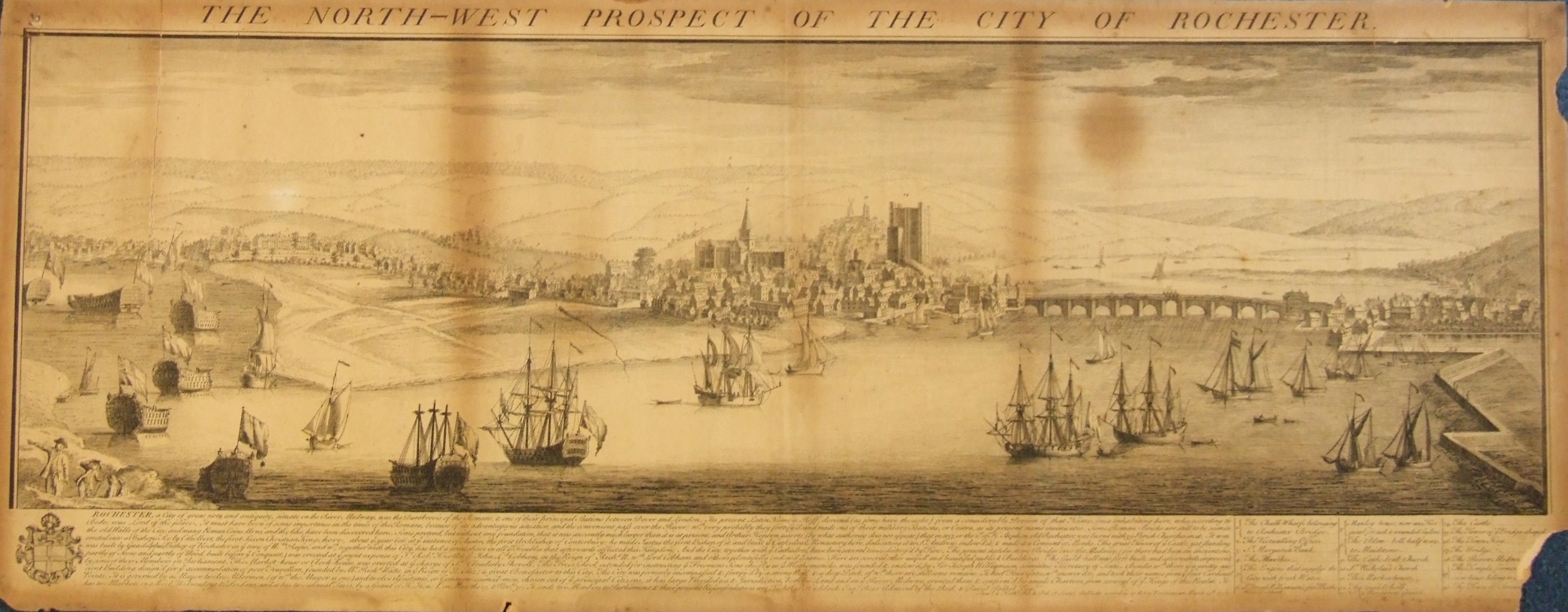 Engraving of a north west view of Rochester in 1738; covers Strood, Rochester & part of Chatham, viewed from Frindsbury Hill; poor perspective in places, castle keep exaggerated; 20 places are labelled; short history of Rochester printed beneath. Backed onto card, quite yellowed & some brown staining from damp wood backing of old framing. Produced for Buck's 'Views of Ruins of Castles & Abbeys in England' (1726-1739).