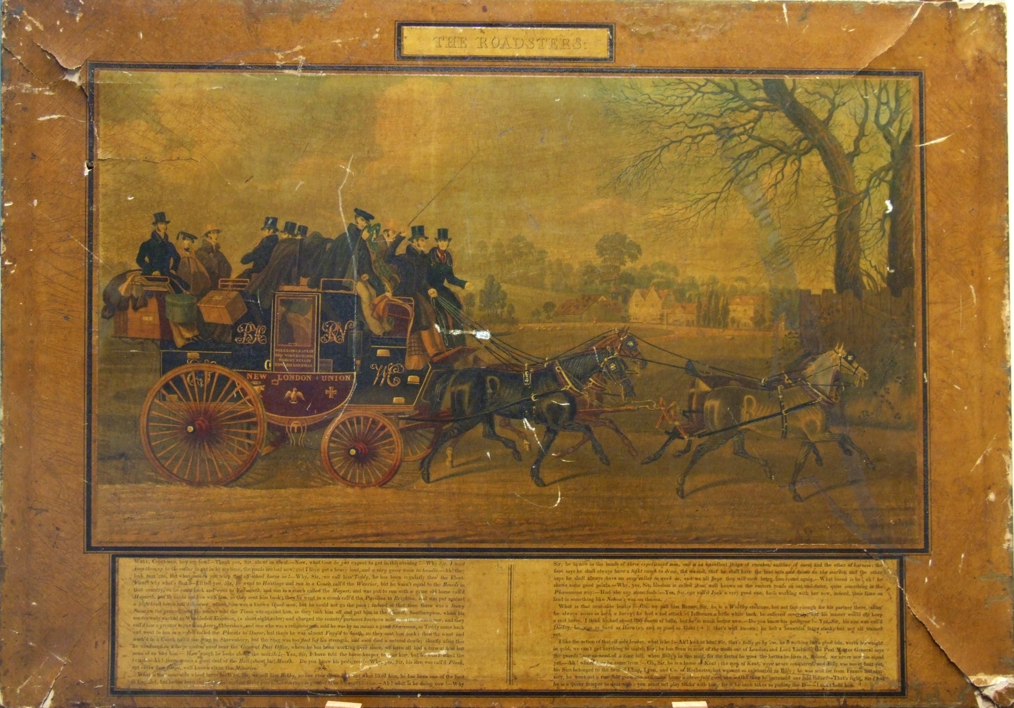 Coloured print of a passenger-carrying Royal Mail road coach entitled 'THE ROADSTERS'; shows a coach run by Chaplin, Horne, Nelson & Sherman; whimsical text beneath about the various qualities of the horses which could be a parody on political figures of the time. Very yellowed & battered, backed with textile & stretched on to a frame; some tears & old repairs.