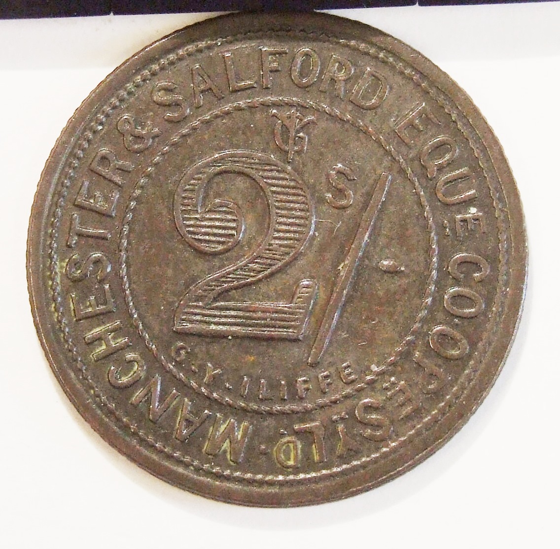 - DescriptionTrade token issued by the Manchester & Salford Co-op Soc Ltd; two shillings value, milled edge. Token issued by trader for advertising.