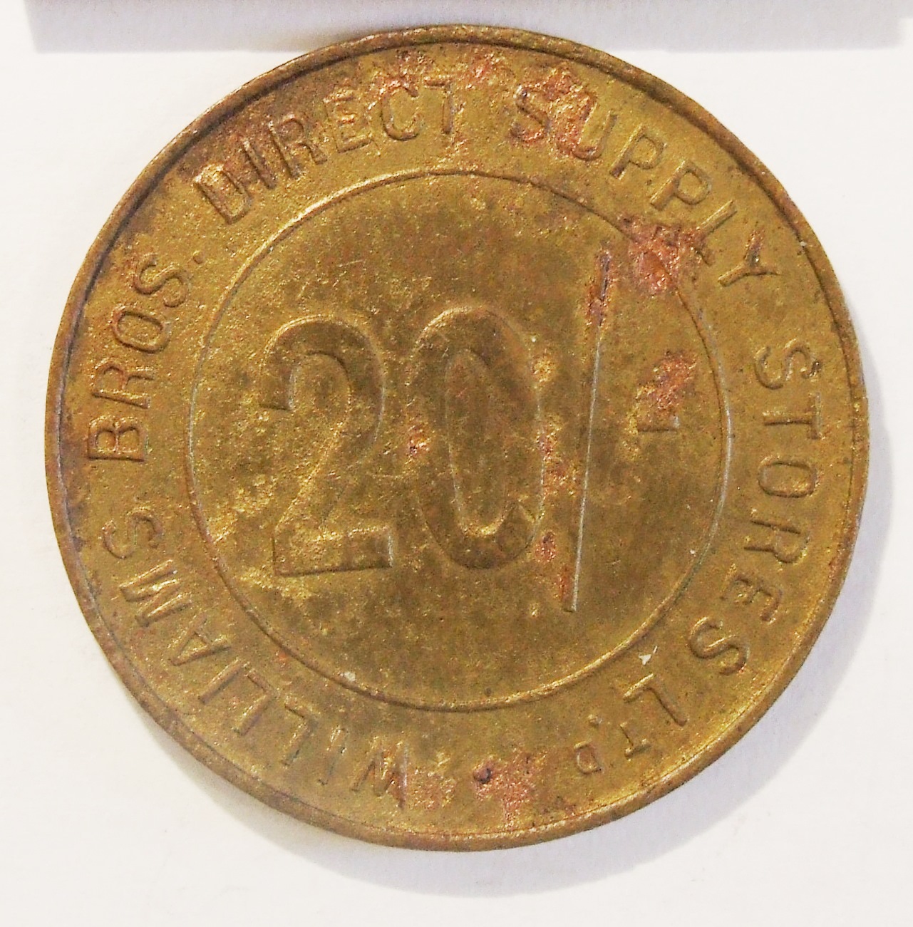 - DescriptionTrade token issued by Williams Bros Direct Supply Stores Ltd; 20 shillings value; double-sided stamped with the same inscription; Williams Brothers Direct Supply Stores Ltd had 150 grocery, butchers & hardware shops in the Home Counties and North London. These tokens were in use circa 1910-1960.
