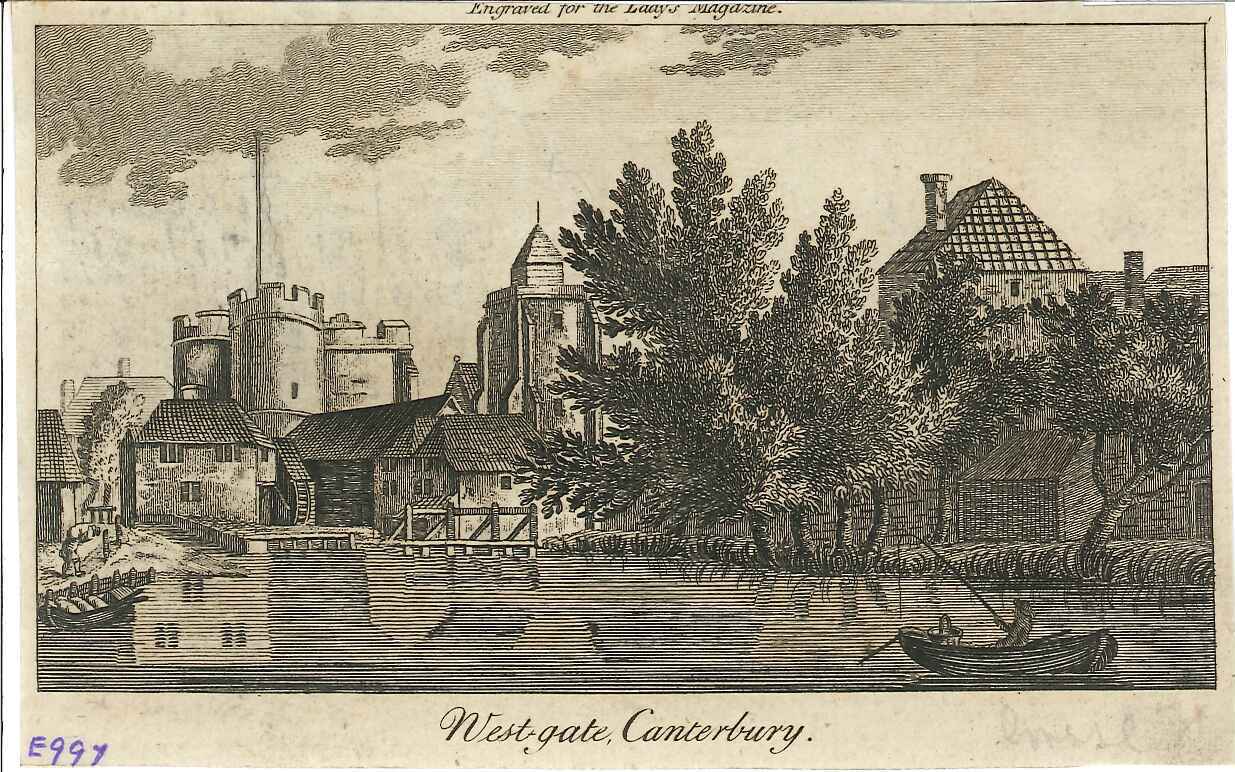 - DescriptionPrint of a view of the West Gate, Canterbury in late 18th century, shows the gatehouse, a church, a watermill & small boat on the river.