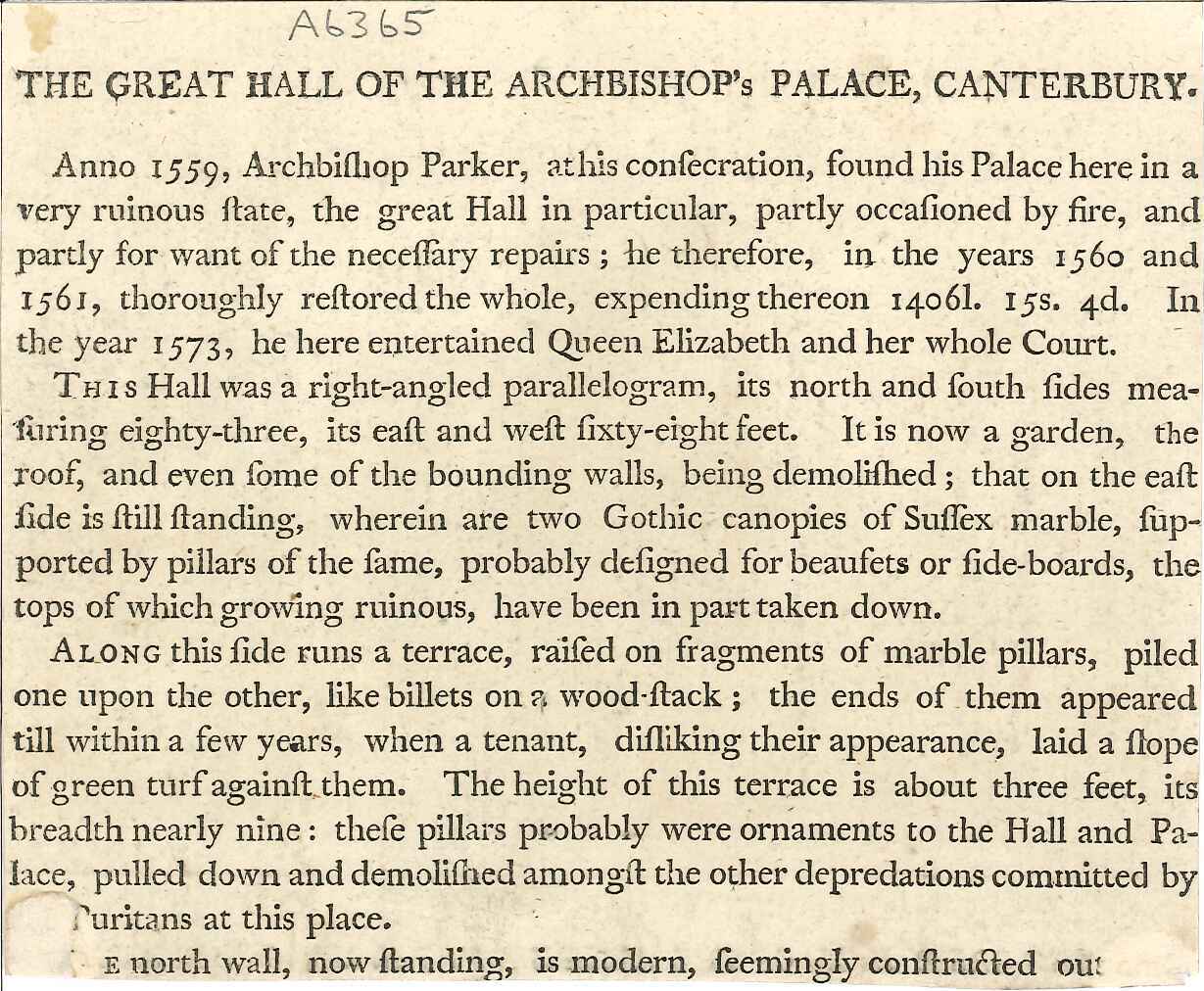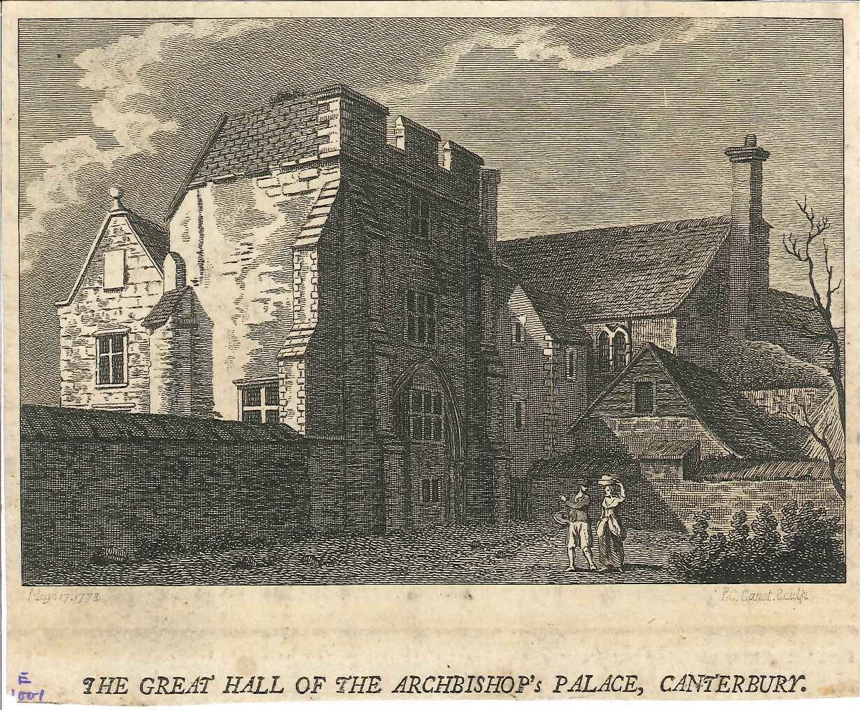 - Descriptionephemera; engraving of a view of the Archbishop's Palace, Canterbury, figures in the foreground; related text on the reverse (see second attached image). The print is dated 1773, though this image is reprinted again in 1784.
