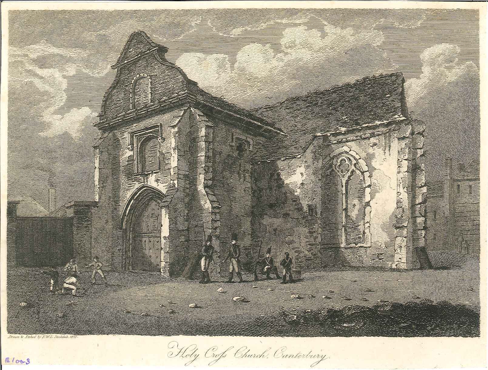 - DescriptionEngraved print of the Holy Cross church, Canterbury; shows group of boys playing & soldiers in the foreground.