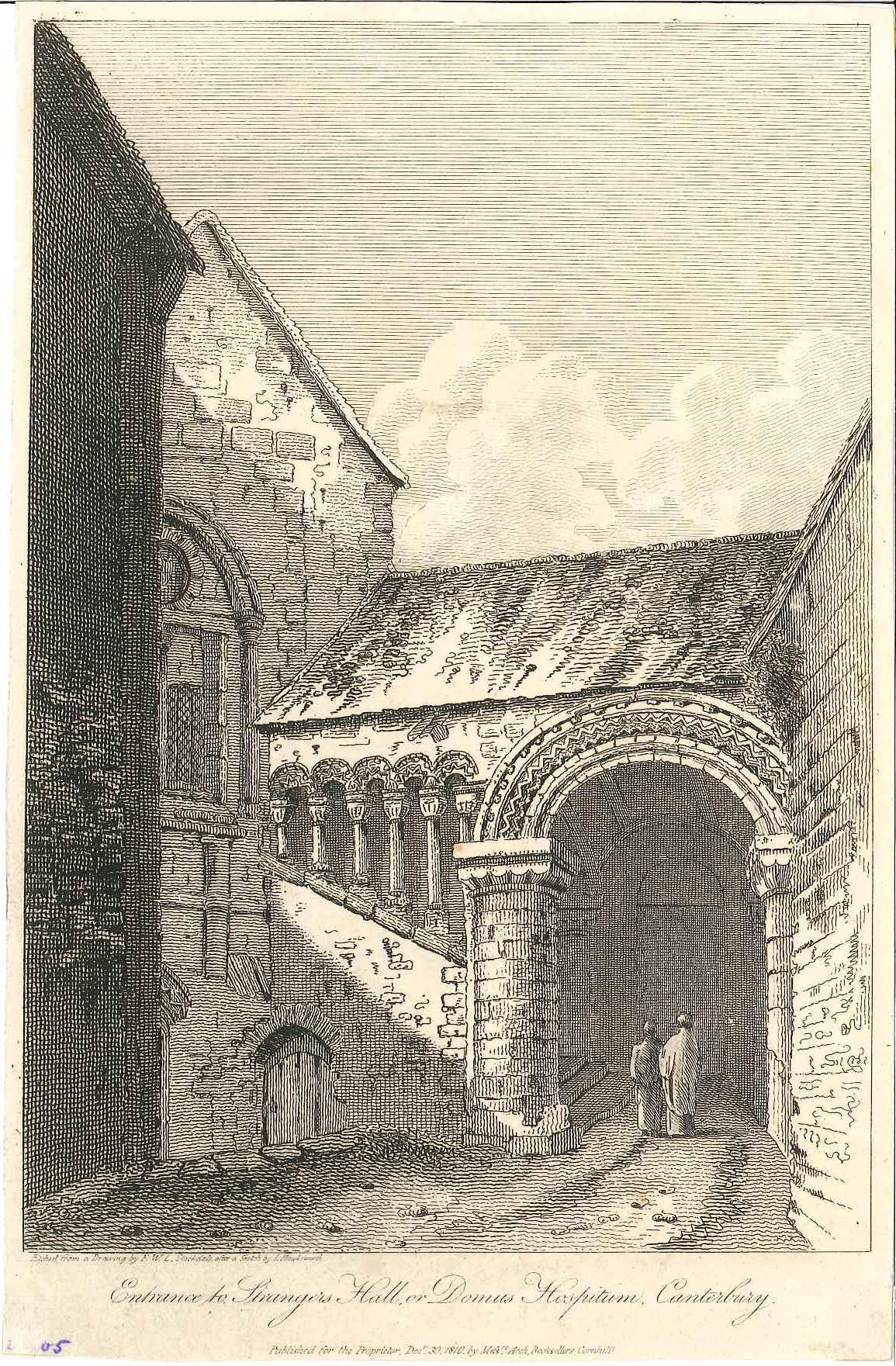- DescriptionEngraved print of the Strangers Hall (or 'Domus Hospitum'), Canterbury; shows a classic Norman 'dogtooth' arch.