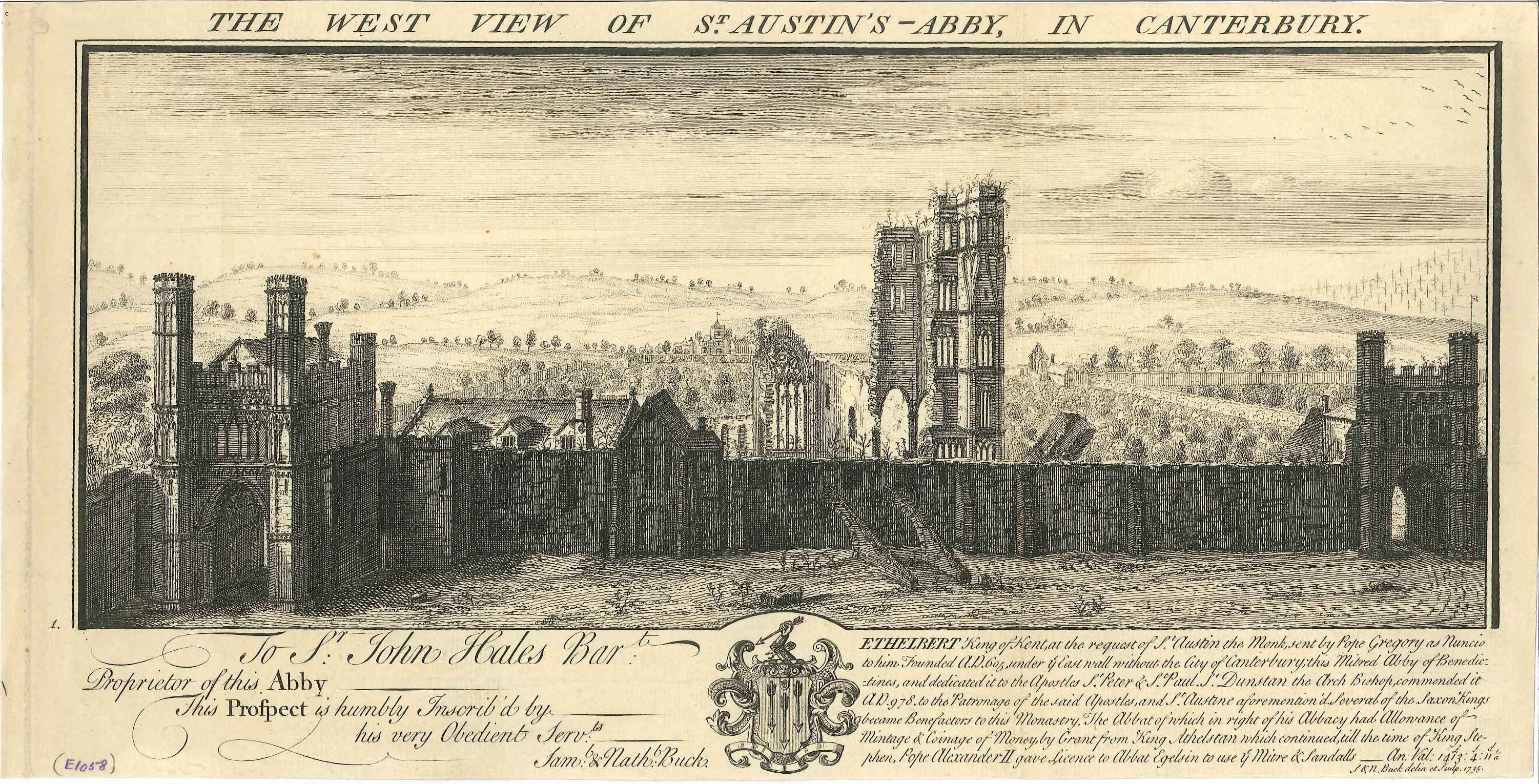 - DescriptionPrint of a west view of St Augustine's Abbey ruins in Canterbury; produced for Buck's 'Views of Ruins of Castles & Abbeys in England' (1726-1739).