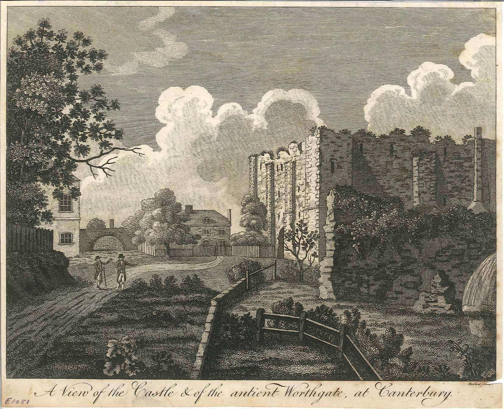 Print of a view of Canterbury castle ruins with Worthgate in the background.