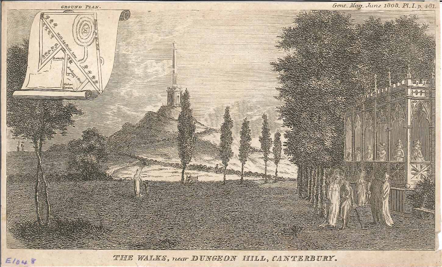 - DescriptionPrint of a 'The Walks' near Danejohn Hill in Canterbury; published in the Gentleman's Magazine in 1808; in the top left is a small inset ground plan of the area.