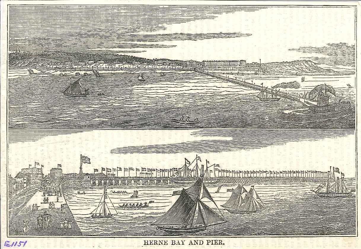 - DescriptionPrint of two views of Herne Bay; the upper view is from the sea, and suspiciously similar to print A6418; the lower view is looking west from the esplanade at the (newly opened?) pier, bedecked with flags; printed in a journal (text on the reverse).