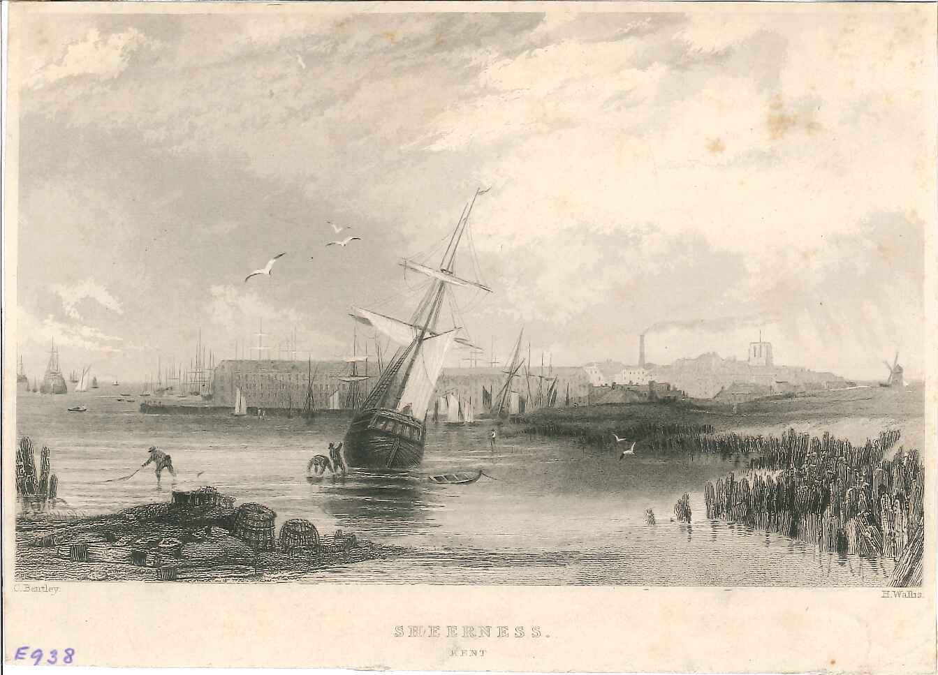 - DescriptionPrint of view of Sheerness, seen from a marshy area nearby; fishermen & boat in the foreground; dockyard in the background; Minster tower & windmill on the horizon.