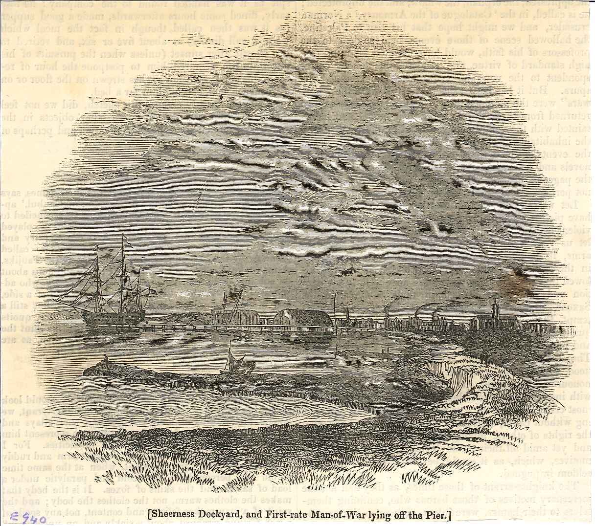 - DescriptionPrint of the dockyard at Sheerness; seen from a distance on a shoreline with flood embankments; taken from a newspaper or journal, with text on the reverse.