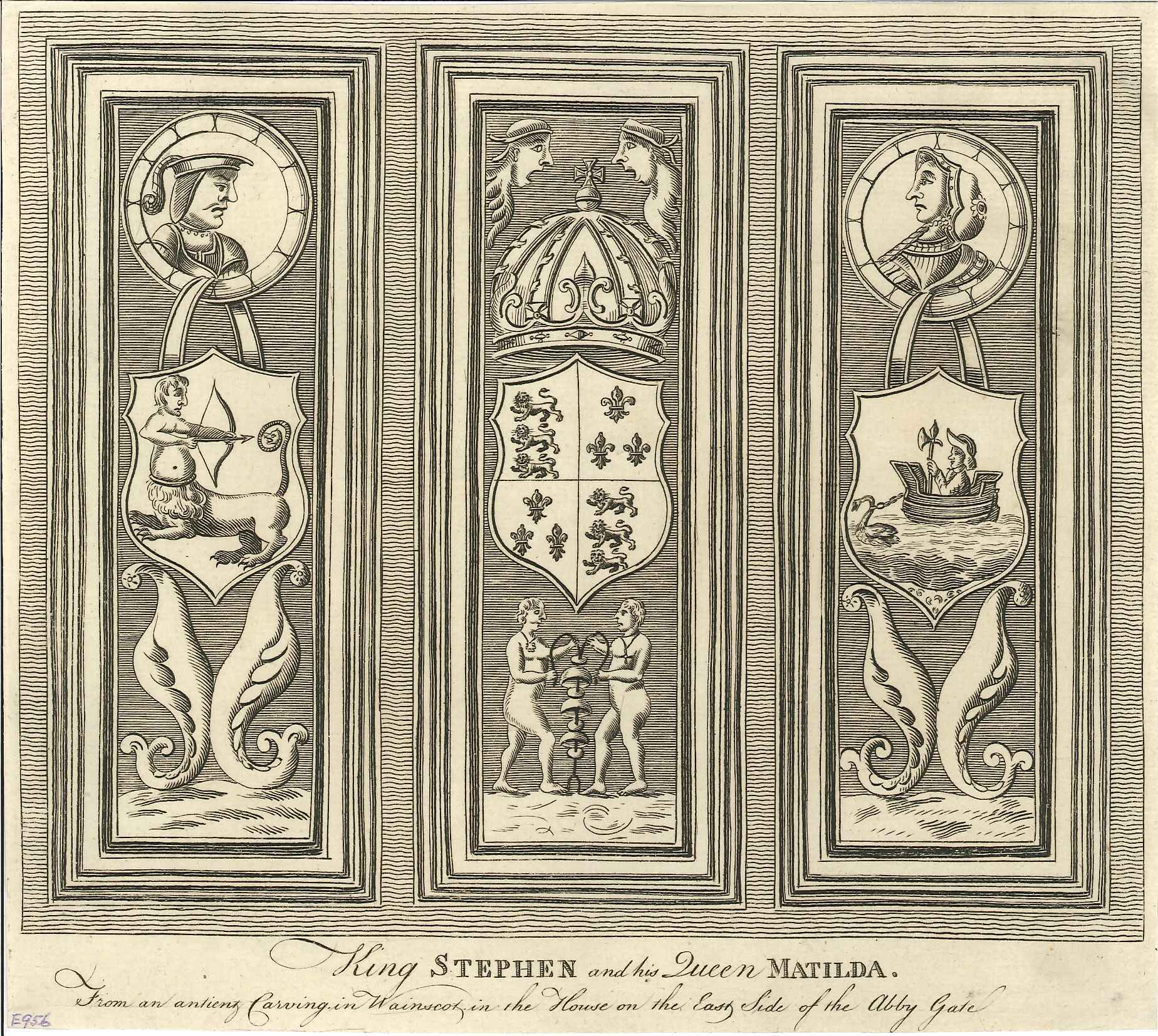 - DescriptionPrint of a view of carvings in Faversham Abbey; depicts King Stephen & Queen Matilda in a series of 3 panels in the wainscot in the Abbey gate; they founded the Abbey in 1147. Published in 'A Bibliographical Account of the Principal Works relating to English Topography' by William Upcott.