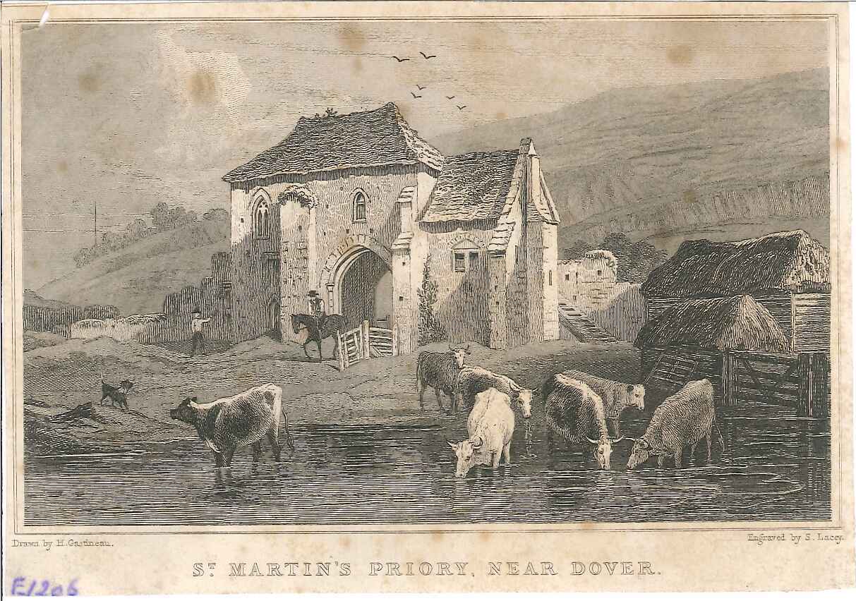 - DescriptionEngraved print of St Martin's Priory, near Dover; a view of the ruined priory with cattle being watered in the foreground. Originally produced for the "England's Topographer" series of Kent views (London 1828-1831). Some light foxing.