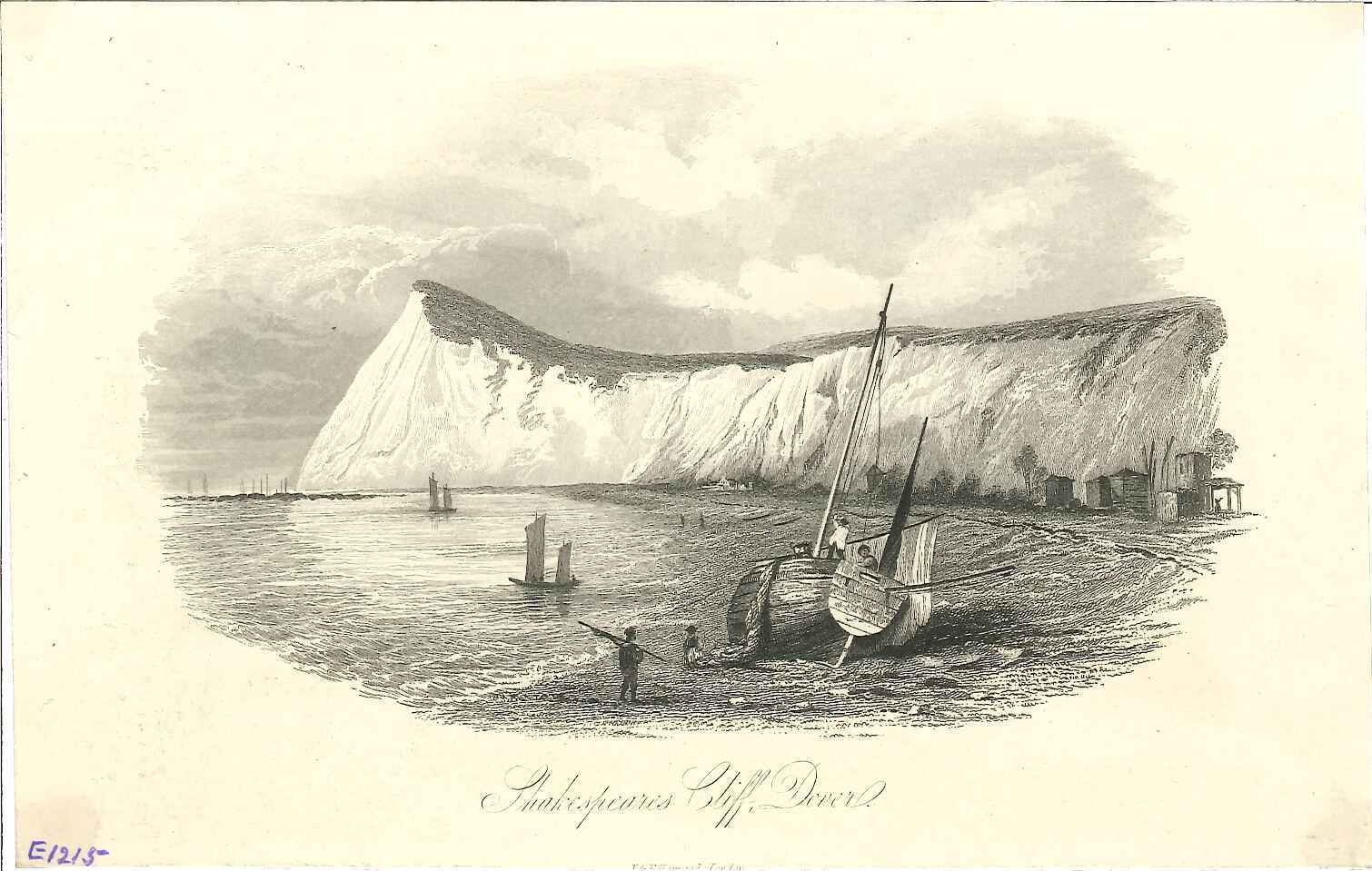 - DescriptionPrint of a view of Shakespeare's Cliff, Dover, viewed from a distance from the beach; shows a beached boat & individuals on the beach, some huts at the foot of the cliff.