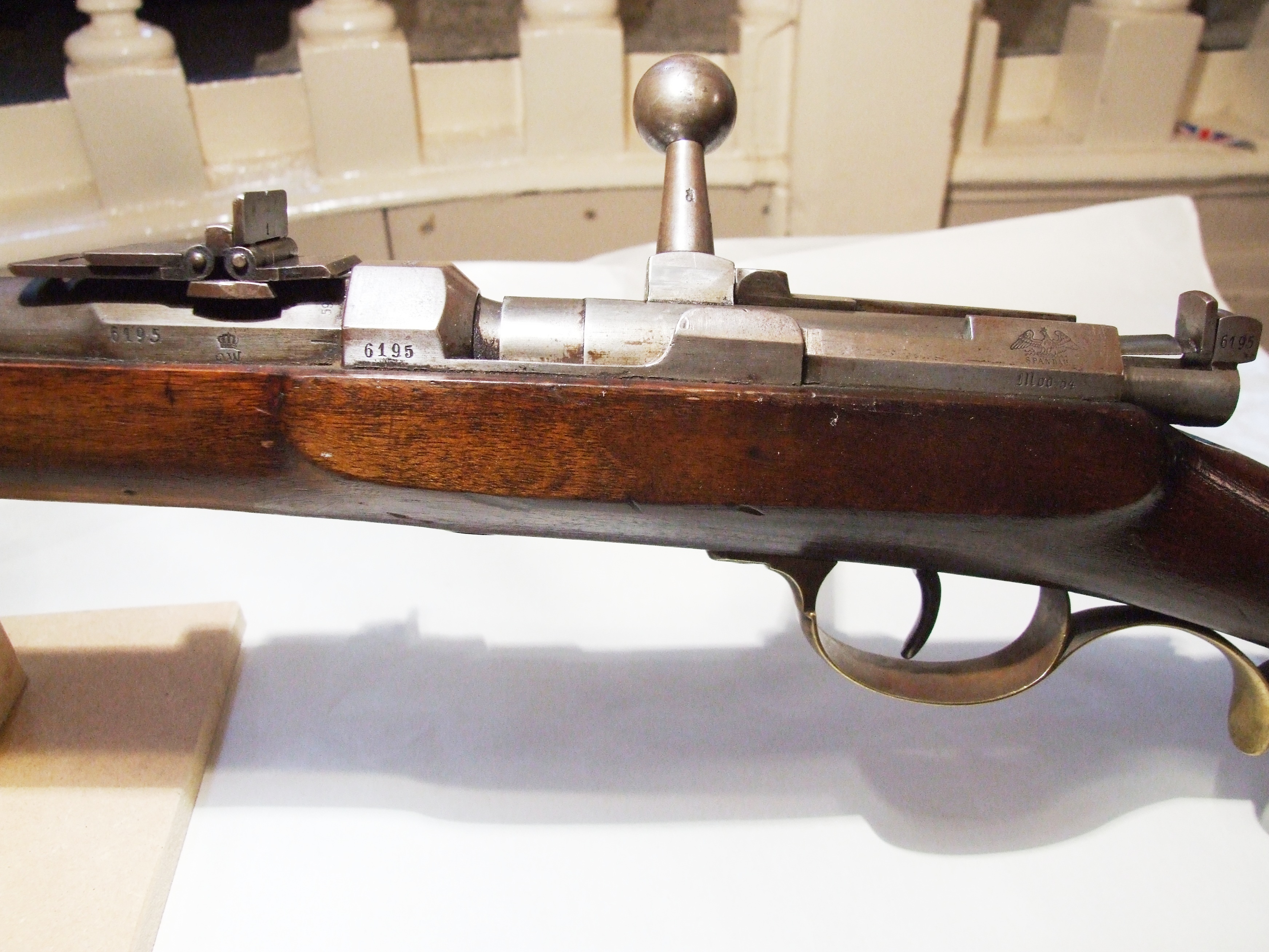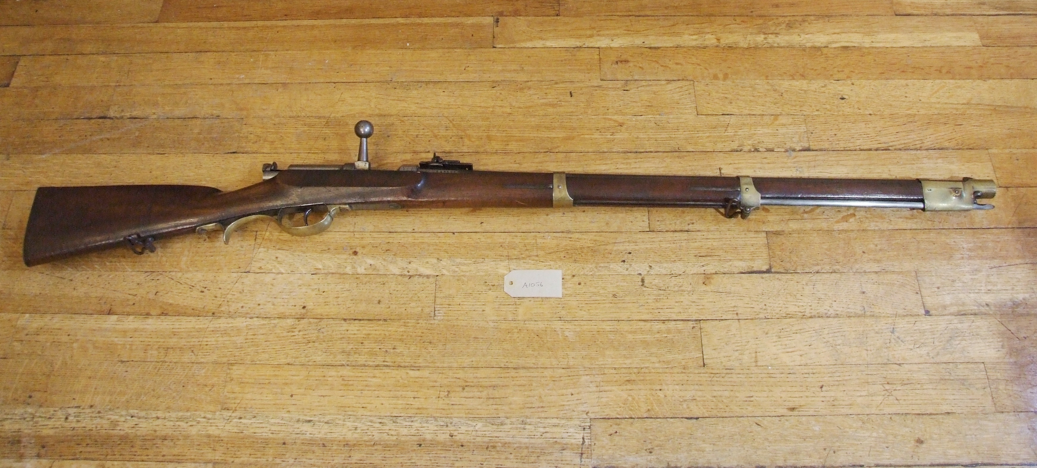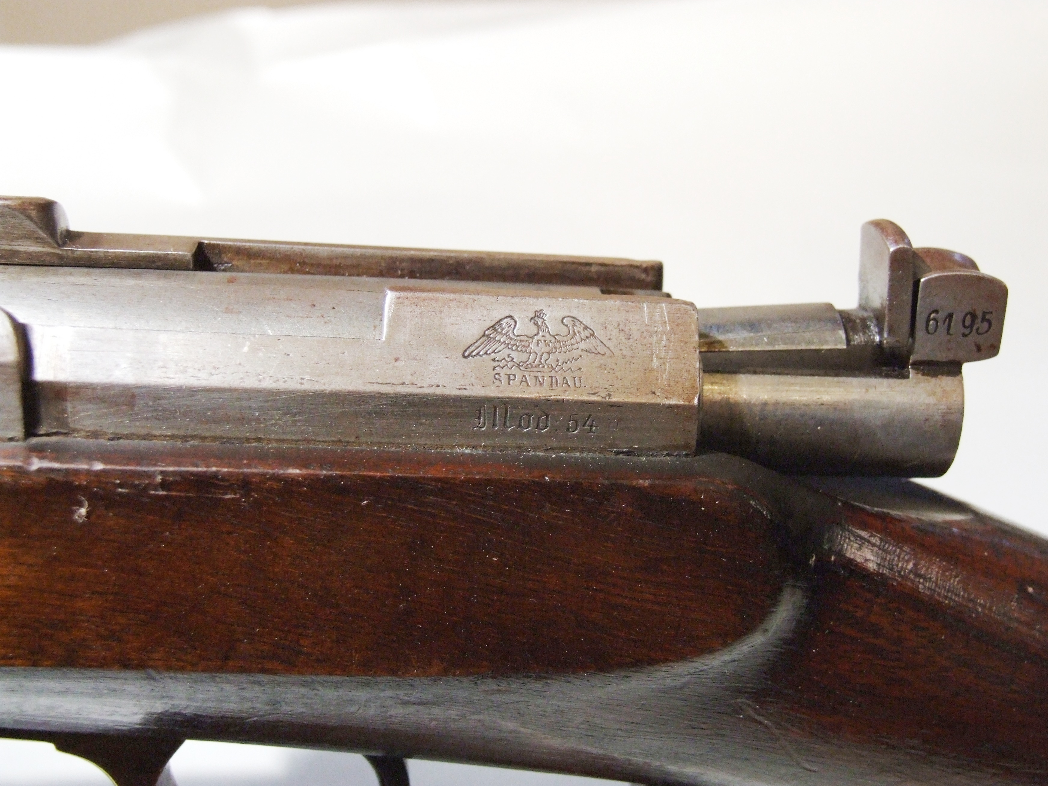 - DescriptionDreyse Model 54 carbine; needle fire, bolt action, breech-loading rifle; slide-out bayonet; good condition, fully working mechanism; stock has additional chinrest; made at Spandau, (Prussia), Germany