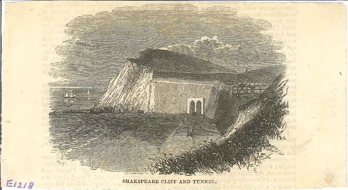 - DescriptionEngraved print of the coast at Dover showing Shakespeare's Cliff & railway tunnel (under construction) circa 1840's; published in a journal or magazine, with related text on the reverse.