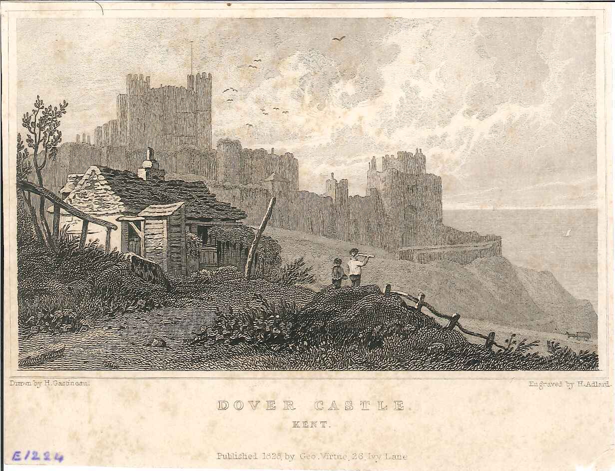 - DescriptionEngraved print of Dover castle in the distance; in the foreground is a derelict timber cottage with a boy & a man with a telescope viewing the sea. Originally produced for the "England's Topographer" series of Kent views (London 1828-1831).