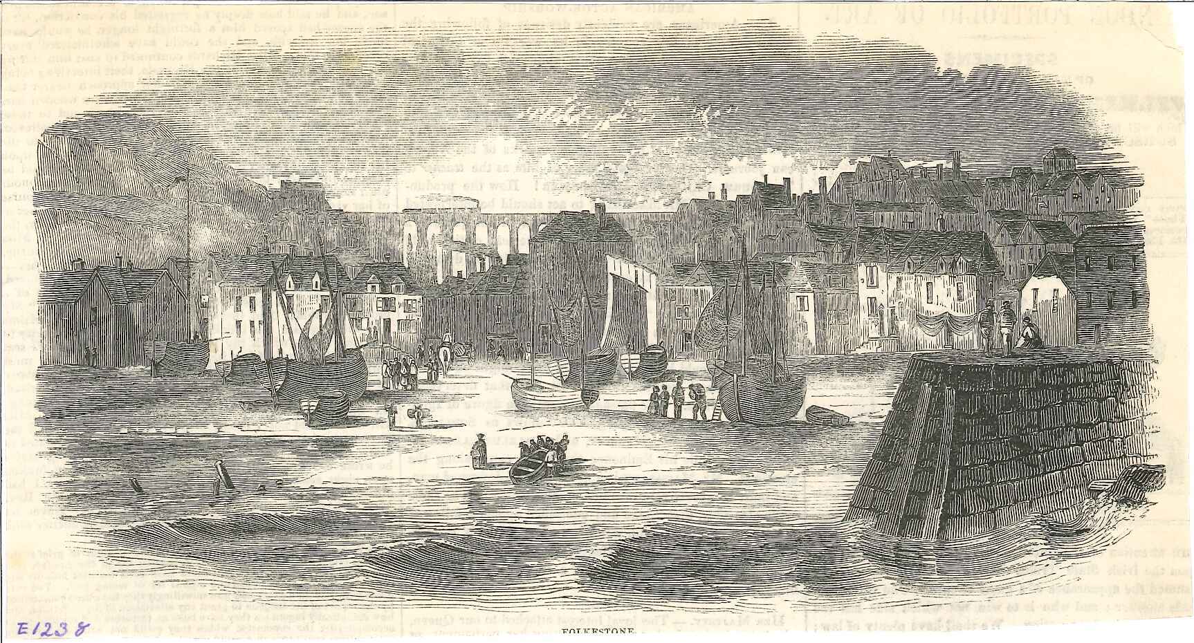- DescriptionEngraved print of a view of Folkestone harbour from the sea; shows numerous beached small boats, town behind, and steam train crossing a railway viaduct on the horizon; printed for a magazine or journal, unrelated text on the reverse.